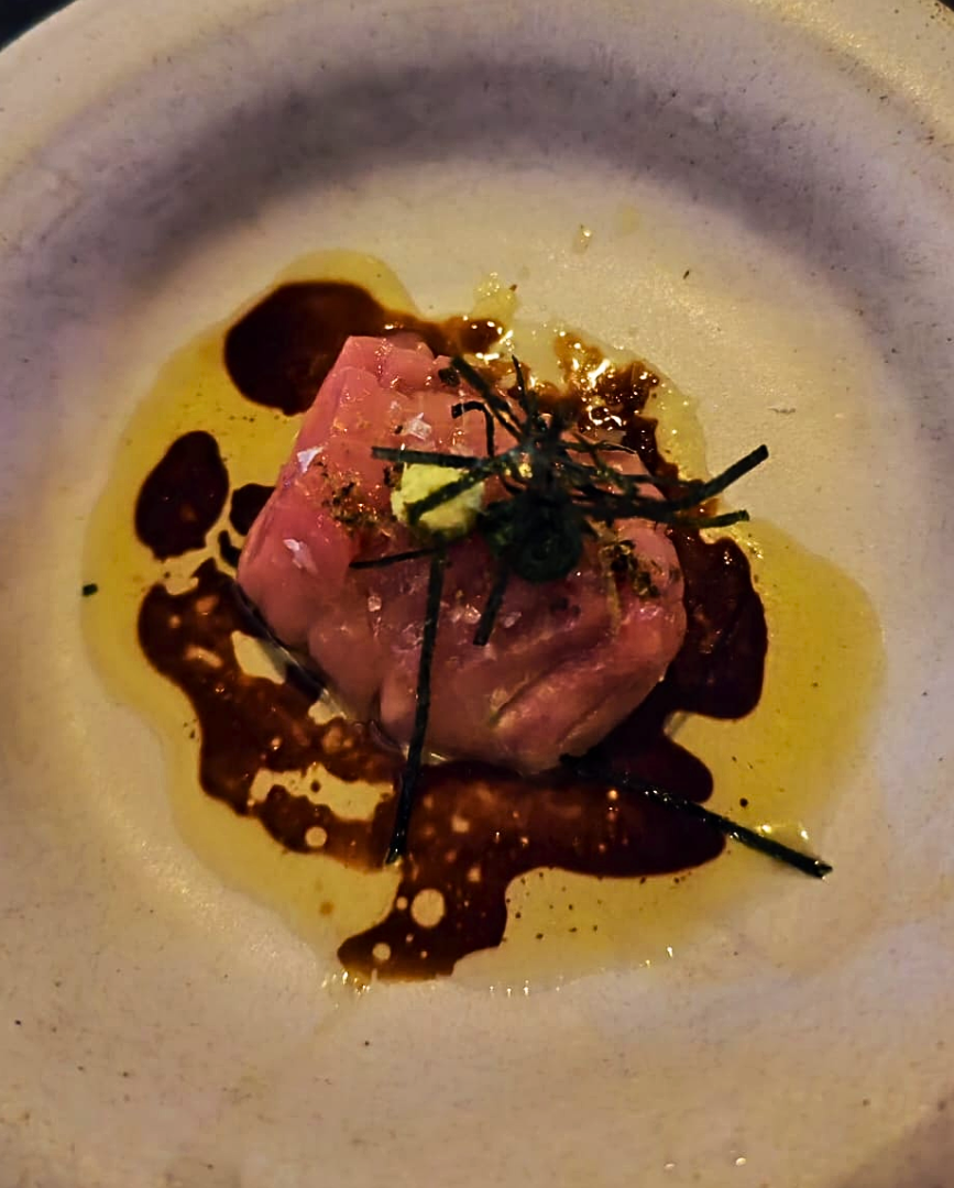 המנה הבאה: שתי יחידות של טרטר בקר (68) מוגש על מחמצת צרובה ומעליו ערימה ענקית של פרמזן. חובבי הטרטר הקלאסי אולי לא יאהבו את הטוויסט, ואין ספק שזה פחות בקטע של להרגיש את הטעמים של הבשר, אבל אני ממש אהבתי את זה. צורת ההגשה יצרה קשת שלמה של מרקמים מהבסיס הקראנצ'י דרך הבשר ועד הענן של הפרמז'ן. דורש מאמץ לאכול את זה בלי שיתפרק אבל המאמץ השתלם.