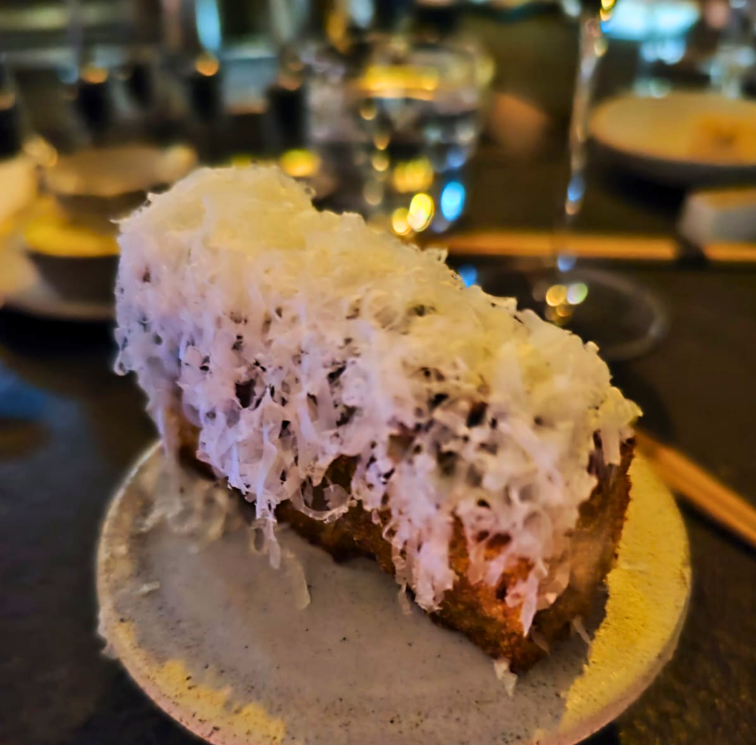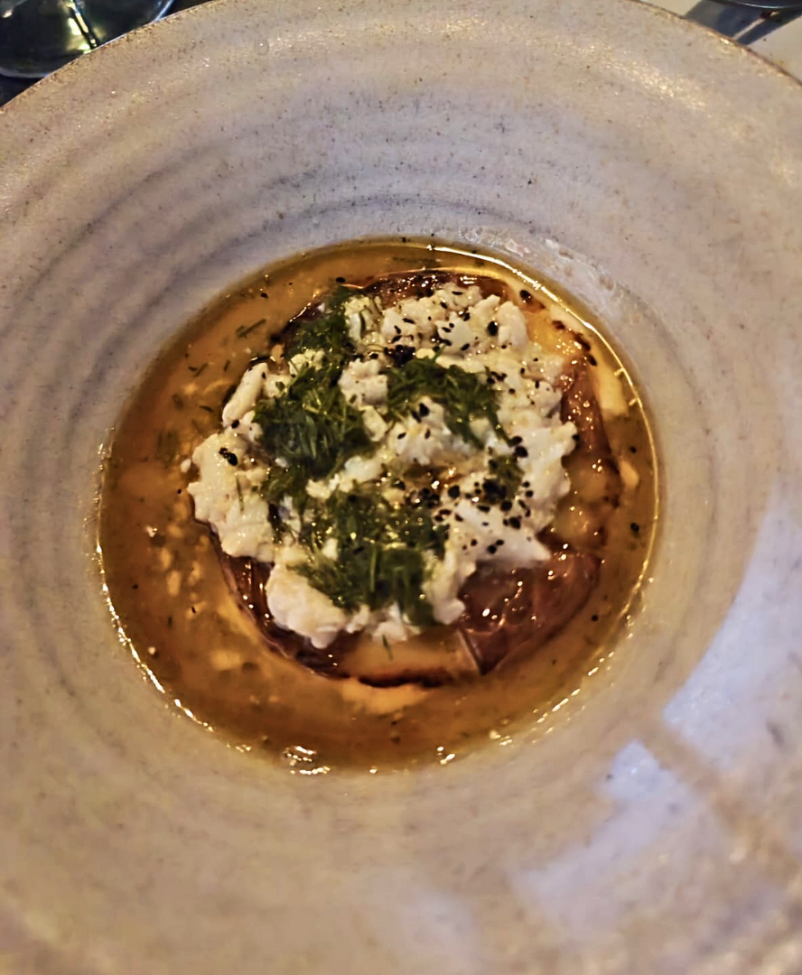 פתחנו בלחם מחמצת (34) עבה פציח וחם(!) שהיה מצויין אבל לא צולם. הוגש עם שלושה מטבלים. האחד איולי שהיה קצת מלוח מדי. השני שהיה טעים מאד, מאד לא מקצועי מצידי, אבל שכחתי. השלישי קרם פרש עם דבש, טעים מאד אבל לא כל כך הסתדר לי בתור מטבל לפתיחת ארוחה. זה הרגיש כמו "אני יודע לעשות קרם פרש מצויין. עם מה נגיש אותו? טוב נגיש אותו עם המטבלים של הלחם".