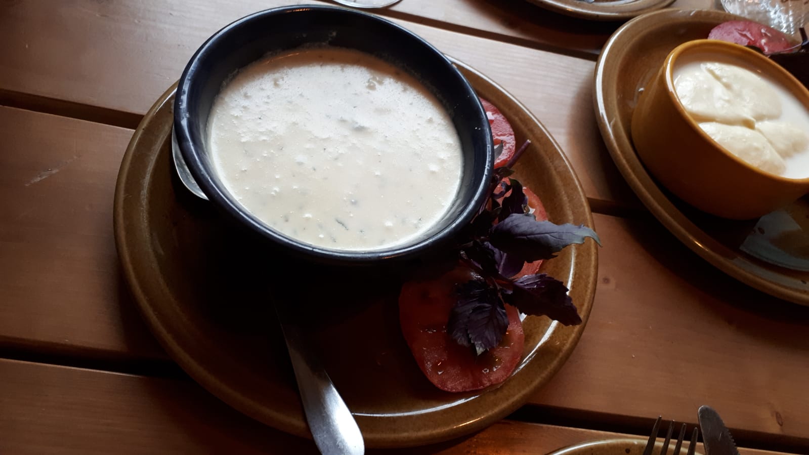 בשניה - אותה גבינה מעורבבת עם נענע ומוגשת במן מרק יוגורט כזה, לצדאותן עגבניות ובזיליקום.