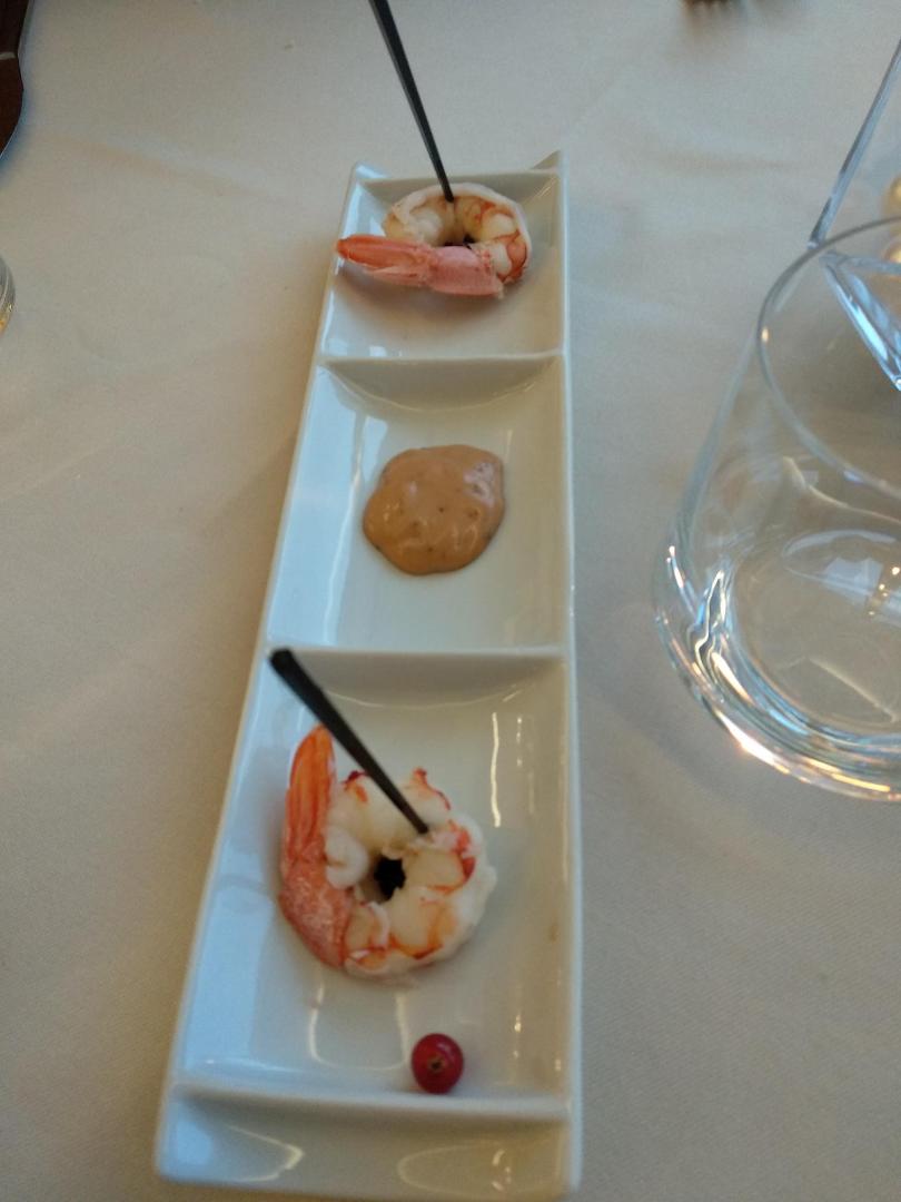 מנת פתיחה על חשבון הבית היו שני שרימפס חלוטים ומקולפים שהונחו במגש