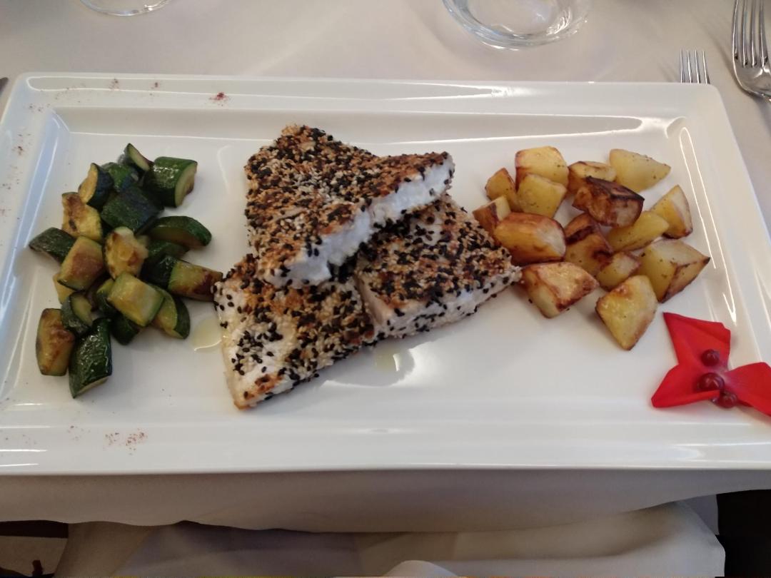 אני אכלתי במנה של שני פילטים עבים של דג ים לבן שצופו בשומשום ולצידן אותן התוספות. הדג היה מצויין – עסיסי ובשרני