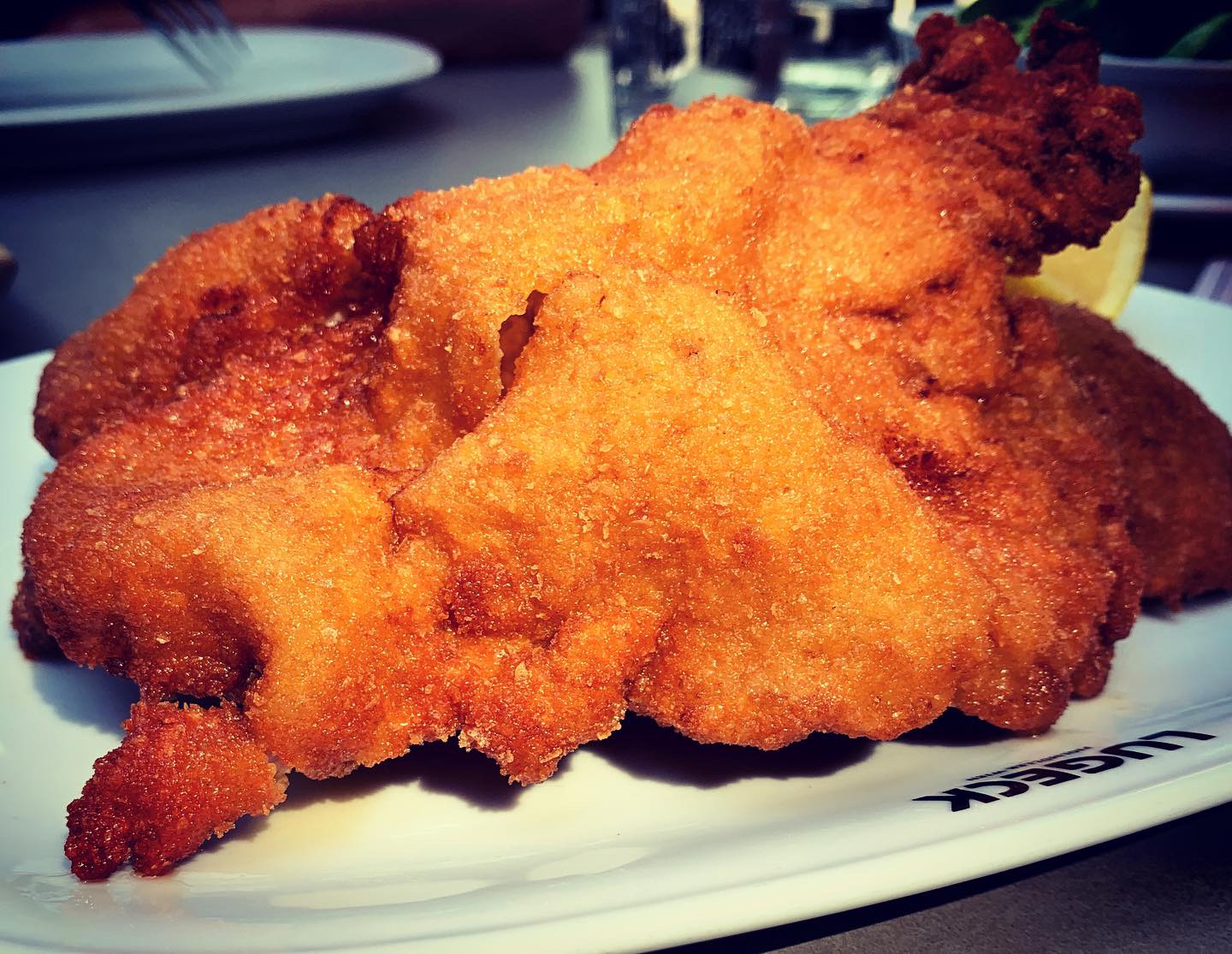 שניצל וינאי בLugeck Figlmüller Wien — השניצל טעים, רך, ציפוי חצי-פריך נעים וטוב. אבל זהו. אמרו לי שפה אמצא את השניצל הטוב בוינה, ואם זה נכון אז זו תהיה אכזבה.