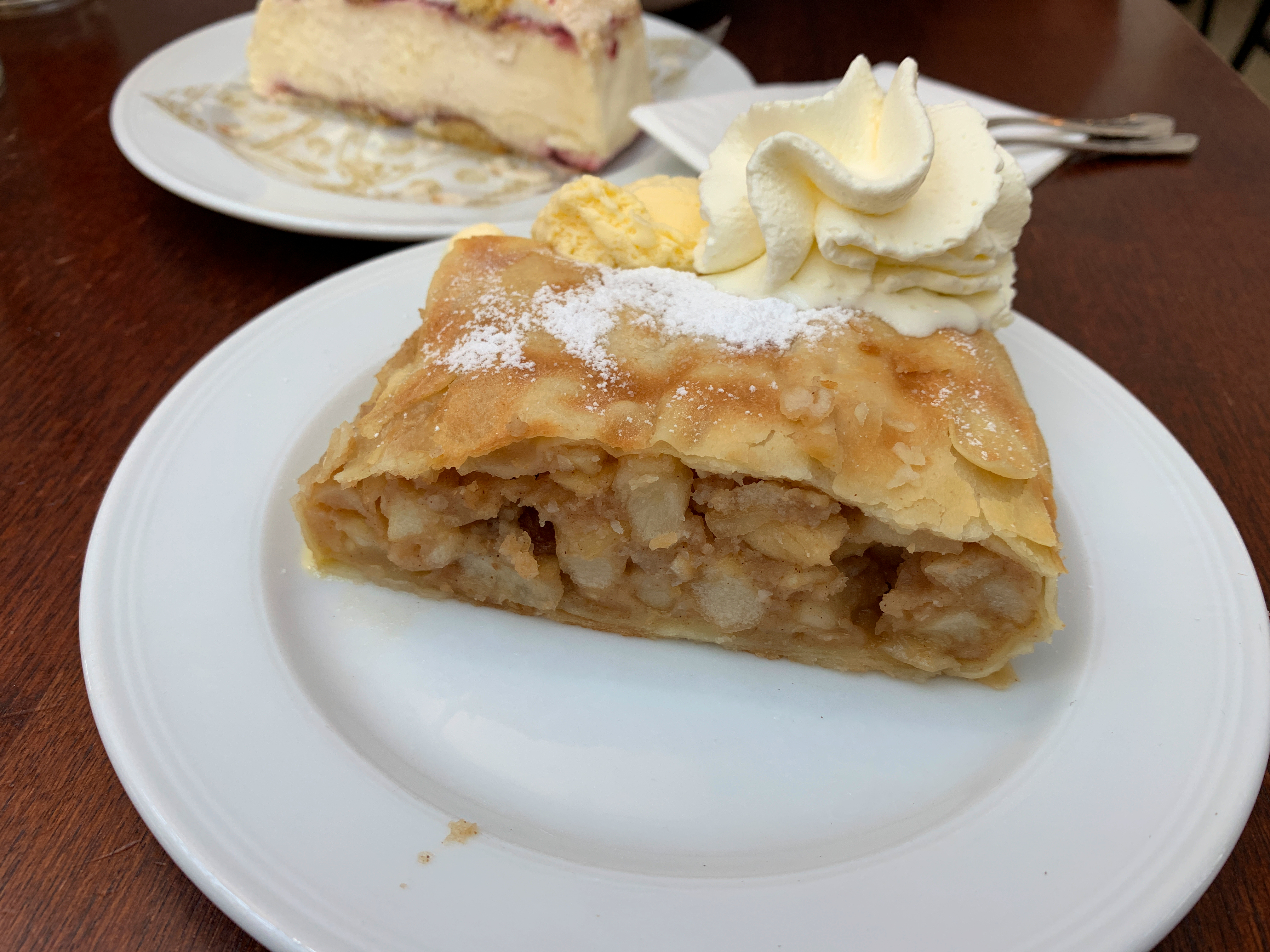 הזמנו שטרודל תפוחי עץ עם קצפת וגלידה, ופרוסת קרדינלשניט (התאומה של הקרמשניט).