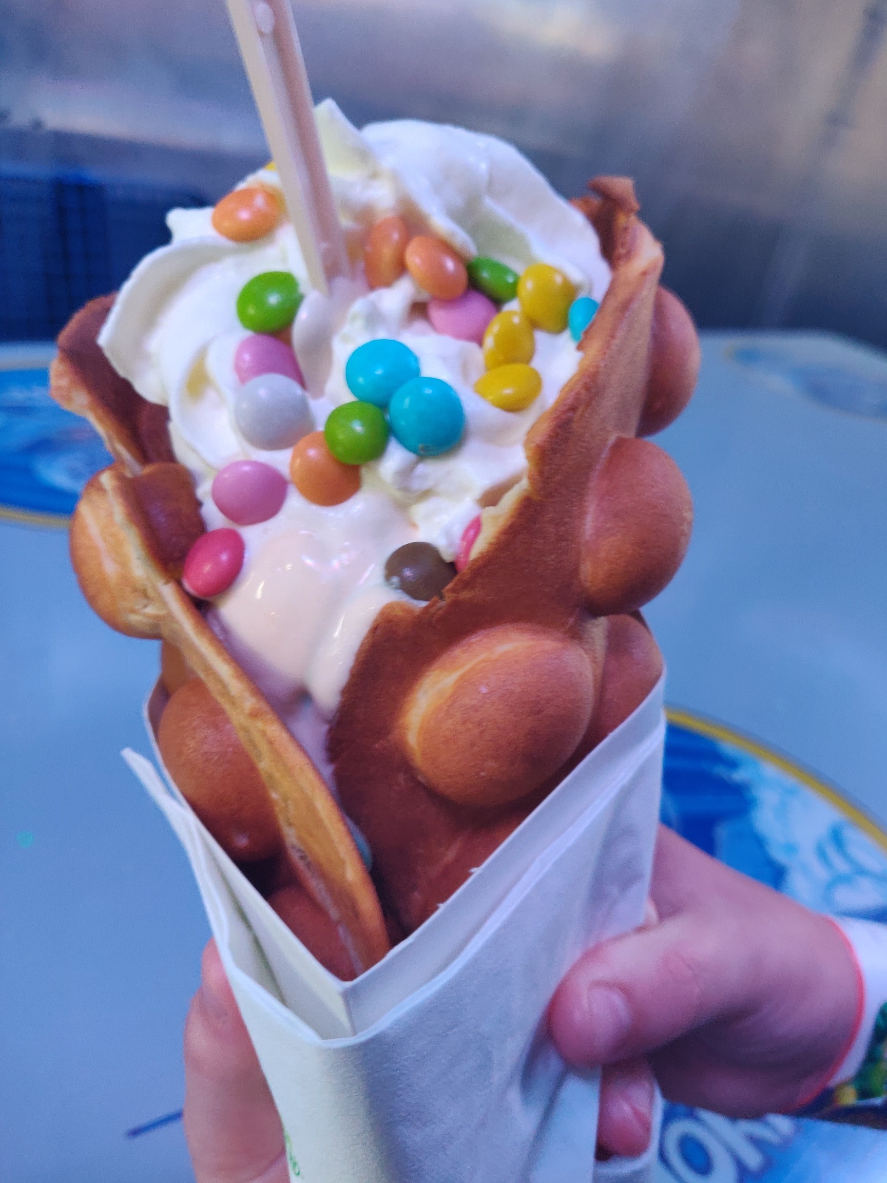 בדיעבד זה הסתבר כשיחוק רציני. הופל היה מעולה. גלידת שוקולד וגלידת בננות שתיהן מוצלחות יחסית למה שאפשר לצפות בסתם דוכן בלונה פארק. אני לא אוהב תוספת M&M בגלידה אבל זה מה שהקטנה מעדיפה, וזו בכל זאת היתה הגלידה שלה... אפילו הקצפת שיצאה ממיכל היתה סבירה מאד. בהנחה שלא קיבלתי אי ספיקה זמנית של חוש הטעם בגלל אחד המתקנים אני חייב להגיד שהופתענו ממש לטובה.