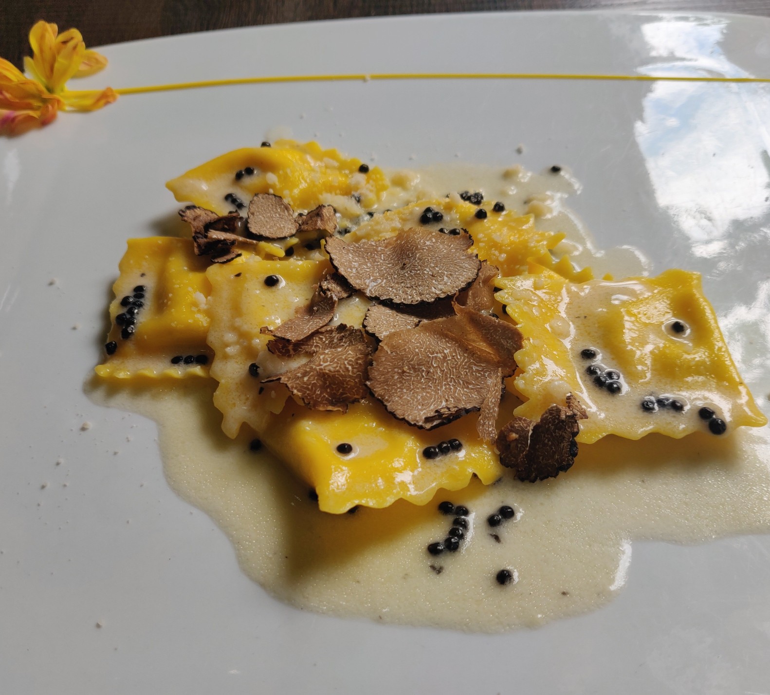 רביולטים קטנים של גבינה וכמהין היו הפרימי. בדיוק הסברתי לקטנה שברביולי כמהין הפטריות זה לא כמו ברוטב שמנת פטריות שהיא מכירה. כיוון שזו פטריה יקרה רק מגרדים קצת לתוך הגבינה בשביל הטעם. ואז הגיעה המנה ויצאתי חומוס. איזה מגדרים קצת. גילופים של כמהין נחו על הרביולי.