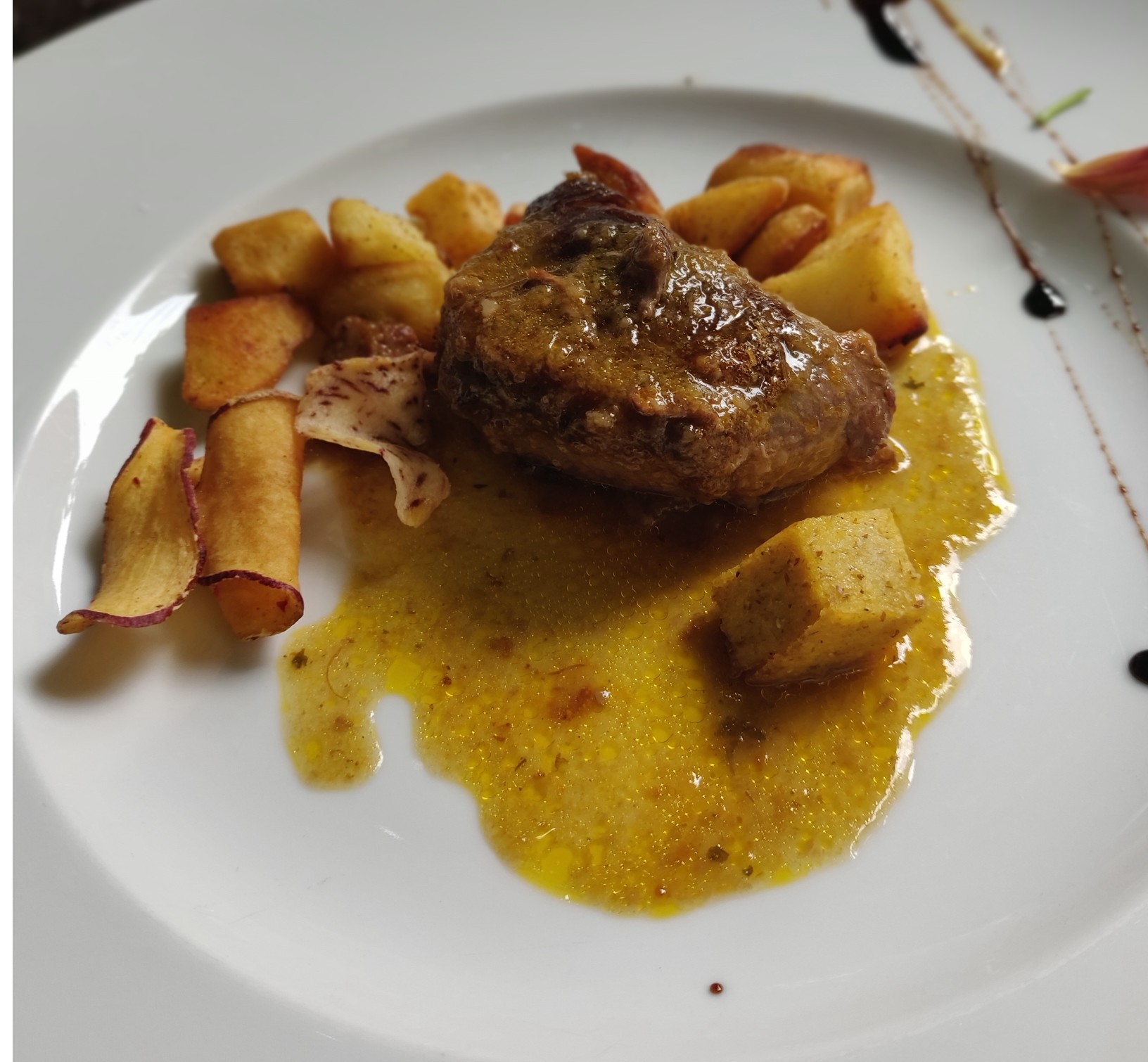מנה שלישית לחי חזיר בתוספת ריבועי פולנטה וציפסים דקים. הלחי היה מעולה. התפרק ללא צורך בסכין. בלי שהוסיפו לה יותר מדי היא היתה הכוכב של המנה. הפולנטה בצורה הזו היתה די מוזרה ולא תרמה לי. הציפסים המסולסלים היו התוספת היותר נחמדה.