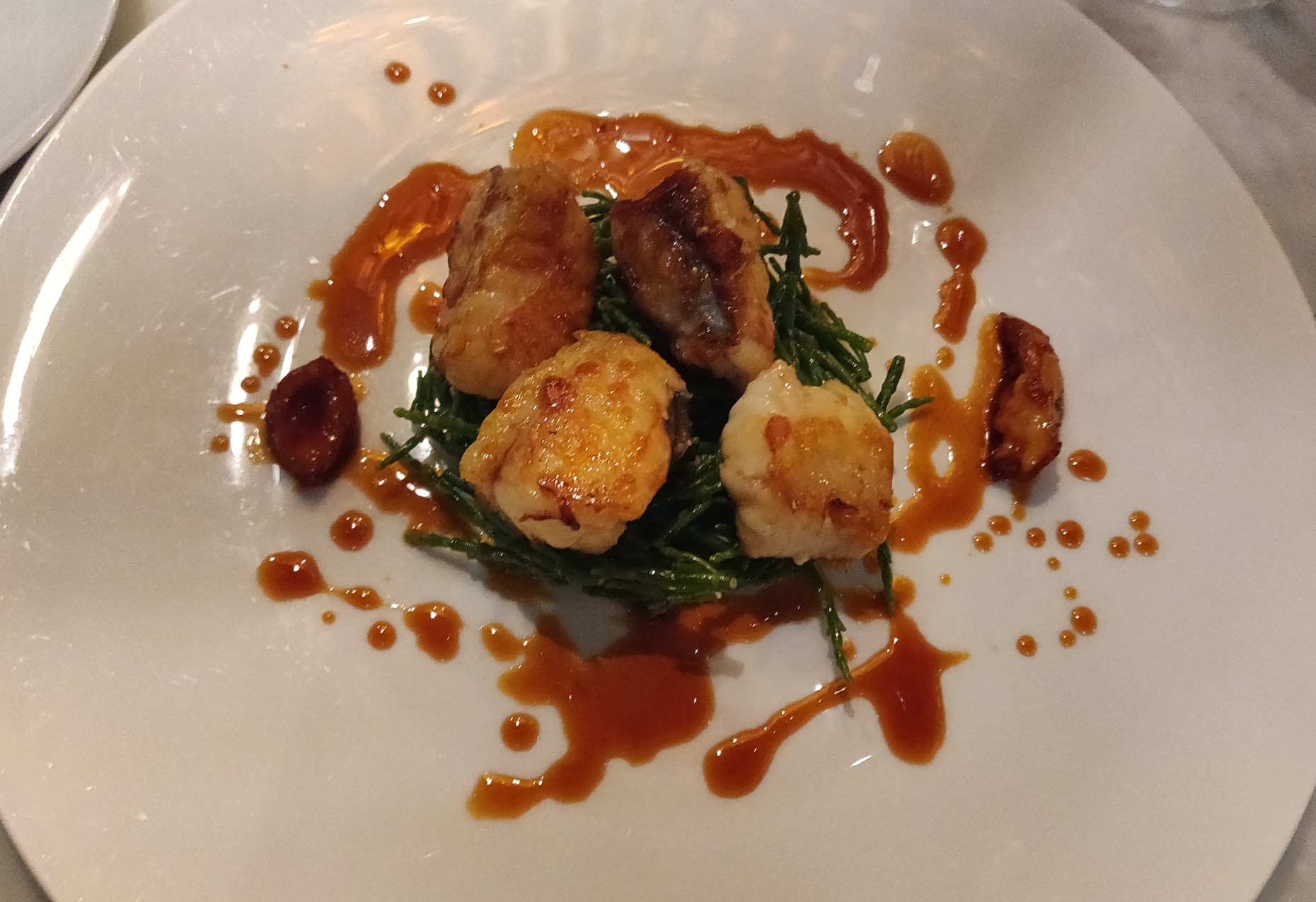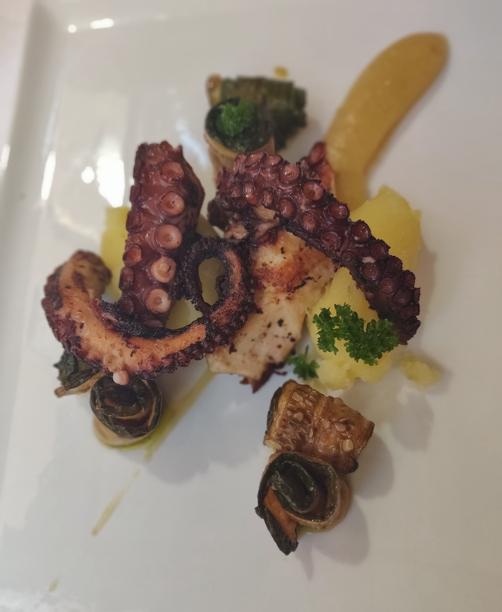 השניה - תמנון צרוב, לטעמי מעט יותר מדי, ועל כן נטה קצת לצד היבש של הסקאלה אבל עדין טעים. הוגש עם תלתלי זוקיני ורוטב לימוני במרקם של רסק תפוחי עץ. מנה מוצלחת מאד למעט הורדת ניקוד קטנה על המרקם.