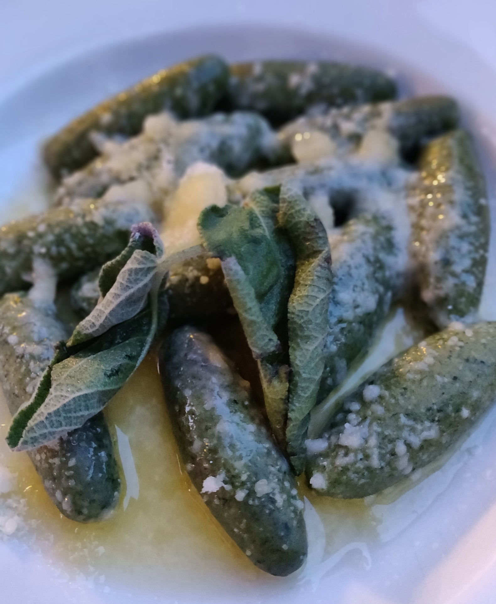 העיקרית השניה - ניוקי לחם. אף פעם לא אכלתי ניוקי כזה וזה היה וואו שני באותה ארוחה. המרקם של זה היה שונה לגמרי משל הניוקי שעשוי מתפוחי אדמה. מעט יותר דביק מעט יוצר מחוספס. רוטב חמאה עם עשבים. מאד מינימליסטי. בלי שמנת בלי כלום אבל עם טעם נפלא שקשה לפרוט למילים. אם אתם באיזור סירמיונה - לרוץ לנסות. איזה כיף לזכות לאכול משהו כל כך מוכר בגירסה שטרם פגשת ולהתאהב בזה.
