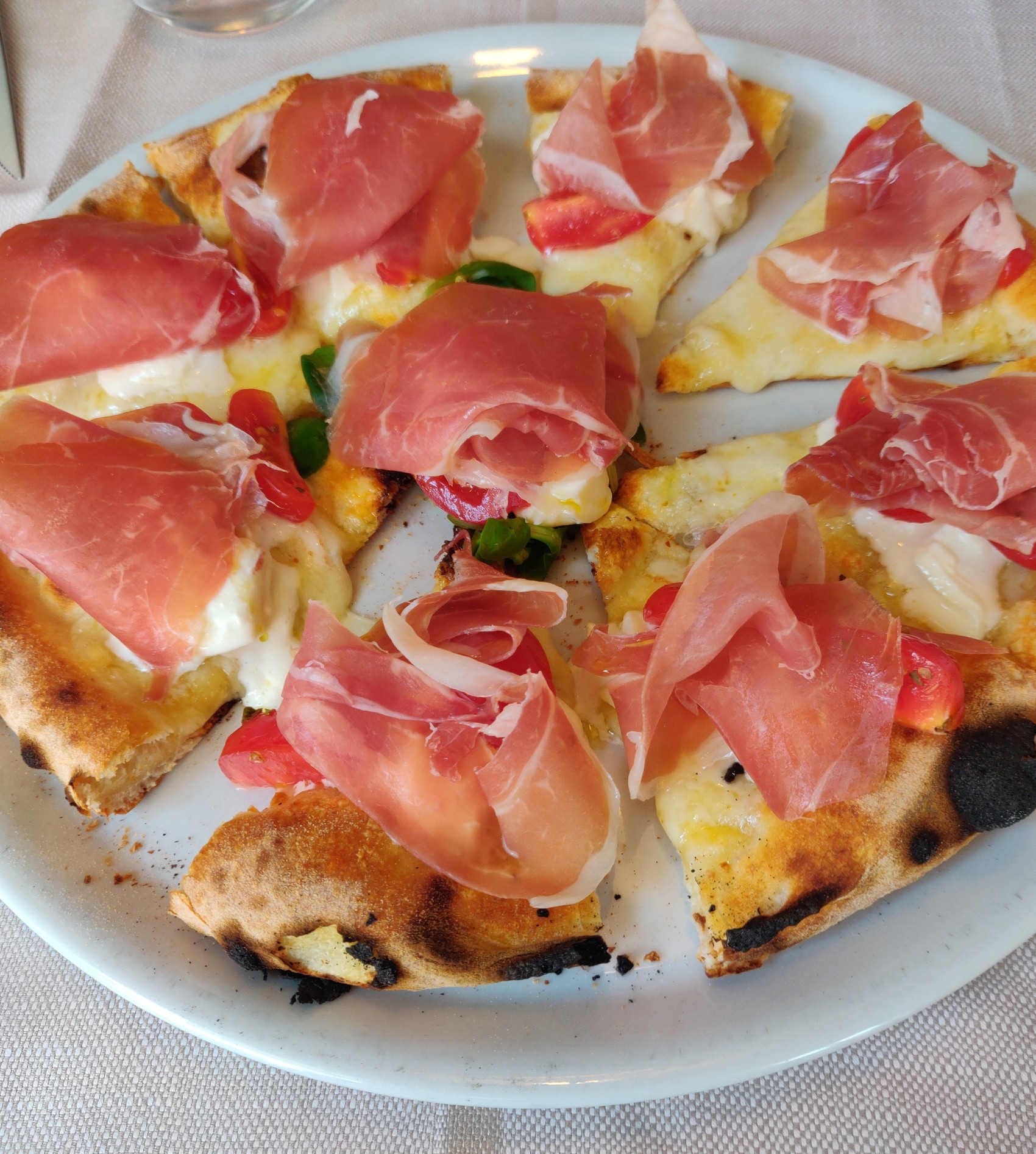 מנה ראשונה חלקנו פיצה. להבדיל מהיום הראשון - בצק מושלם. דק בול במידה בשביל להחזיק מילוי. קריספי במידה. אחד הבצקים הטובים. המילוי אחד מהמיוחדים שלהם פרושוטו שהיה קר וספג את החום מהפיצה תוך כדי אכילה (גימיק נחמד מאד) גבינה ועגבניית שרי. לא המדריך השלם לכל מה שאפשר לשים על פיצה כמו ביום הראשון. שלושה מרכיבים שהולכים טוב ביחד. פיצה נפלאה. אם להיות חצוף - טובה אפילו במונחים תל אביביים. זו גם היתה המנה הטובה בארוחה. האישה הצטערה שלא לקחה פיצה במקום עיקרית.