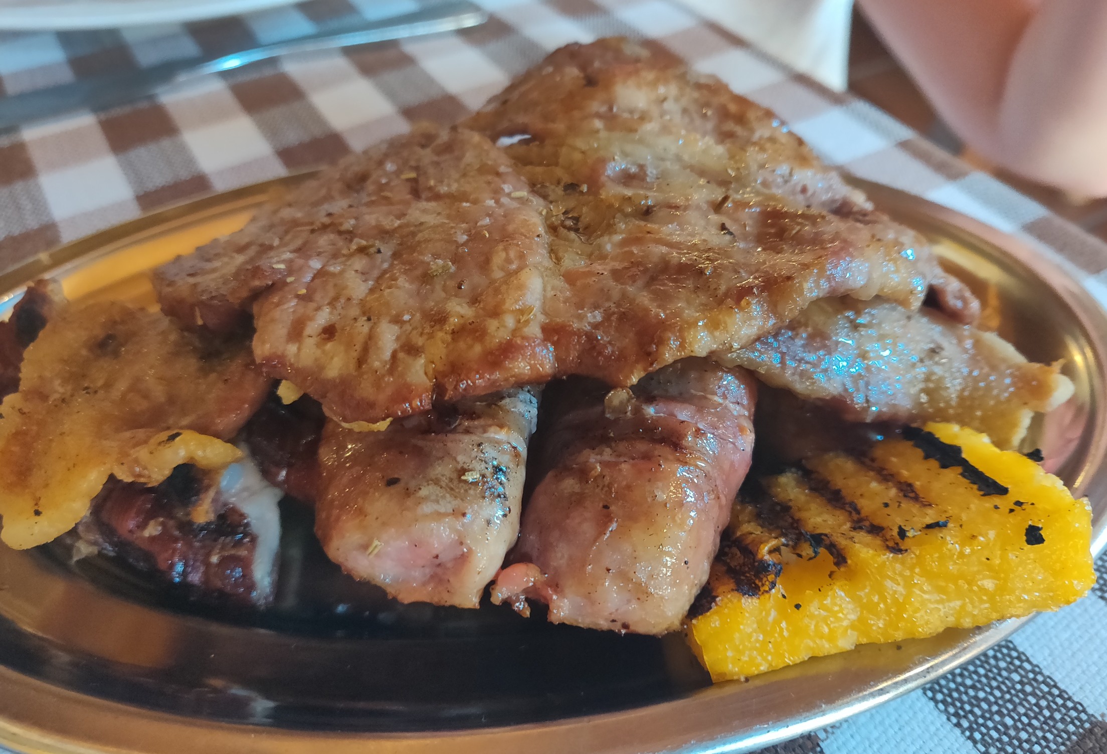 עיקרית ראשונה מיקס גריל של נתחי חזיר. חלק מהנתחים חיבבתי יותר. בין היתר הצלע, ליד העצם, שאכן נאכלה עם הידיים כמו בסעודת אבירים. נקניקייה מוצלחת. אחרים היו פחות מוצלחים בעיניי. אני מניח שאם היו מזמינים אותנו למנגל של חלקי חזיר זה פחות או יותר מה שהיינו מקבלים.