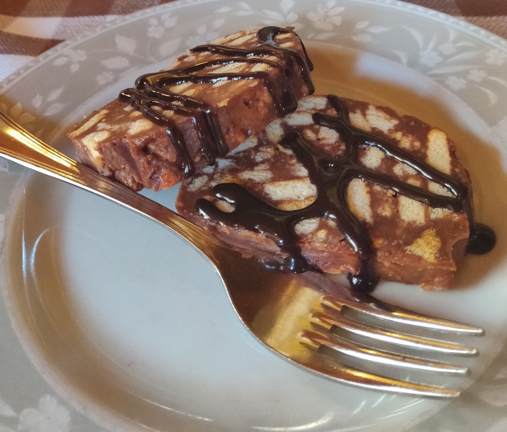 קינוח שני נקניק שוקולד שמאד שיעשע אותנו כי זה סוג של "קינוח הבית" אצלנו במשפחה בארוחות שישי בקיץ. ממש כמו בבית - שוקולד וביסקויטים שמגולגלים לנקניק ארוך נכנסים להקפאה ואז חותכים את הנקניק הקפוא לפרוסות. הכי פשוט וביתי שיש אבל טעים כמו בבית.