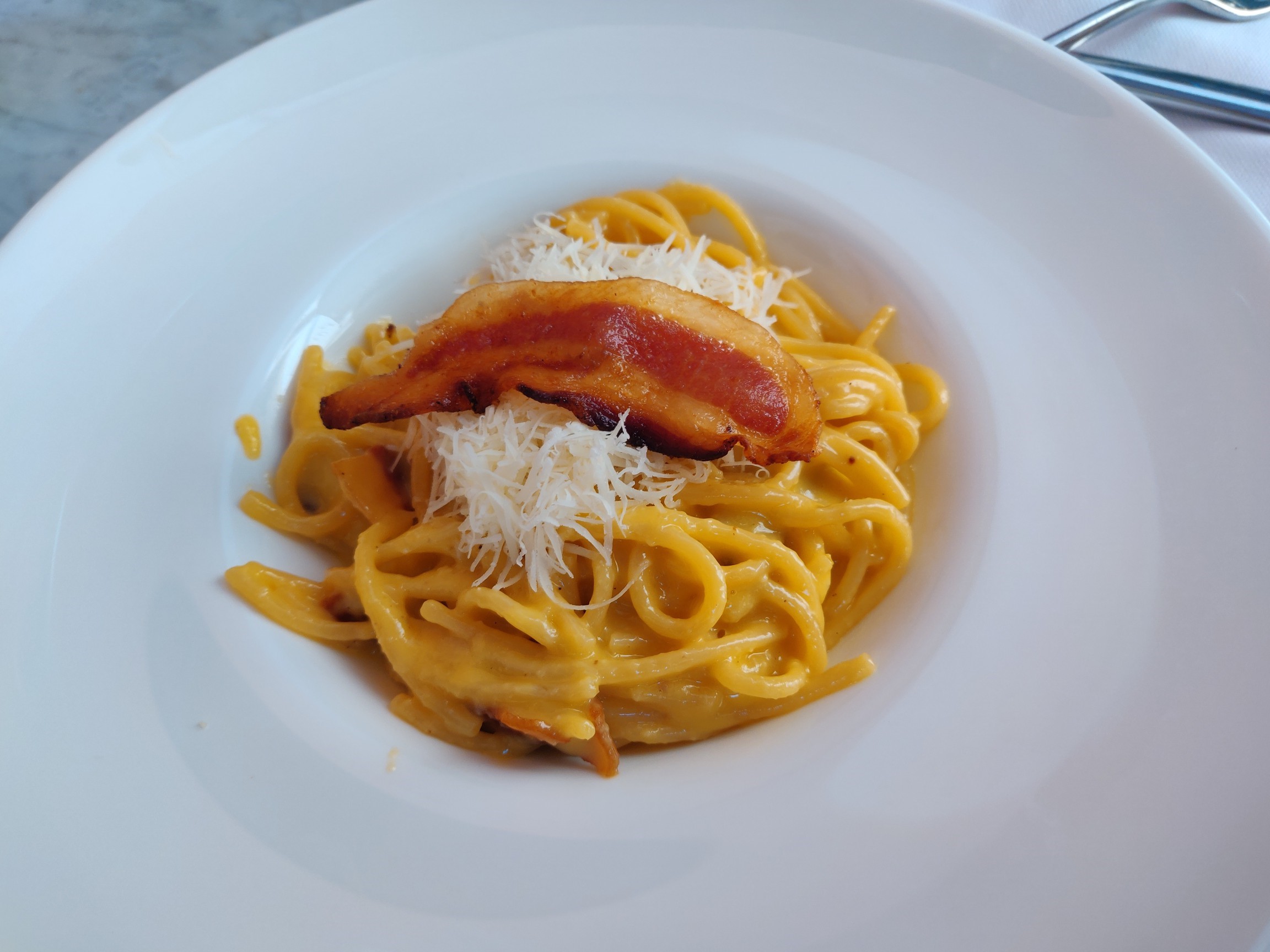 קרבונרה לקטנה היתה השיחוק של הארוחה. פסטה מצויינת. הוגשה ללא שמנת, והחלמון הספיק בשביל לחבר את הכל בלי להפוך את זה לתפלצת כבדה. בדיעבד הסתבר שהשמנת, שתמיד הייתי רגיל שהיא חלק אינטגרלי מקרבונרה, ממש מיותרת. הרבה יותר כיף ככה. הבייקון היה בדיוק בין רך לקריספי. הצלחה גדולה.