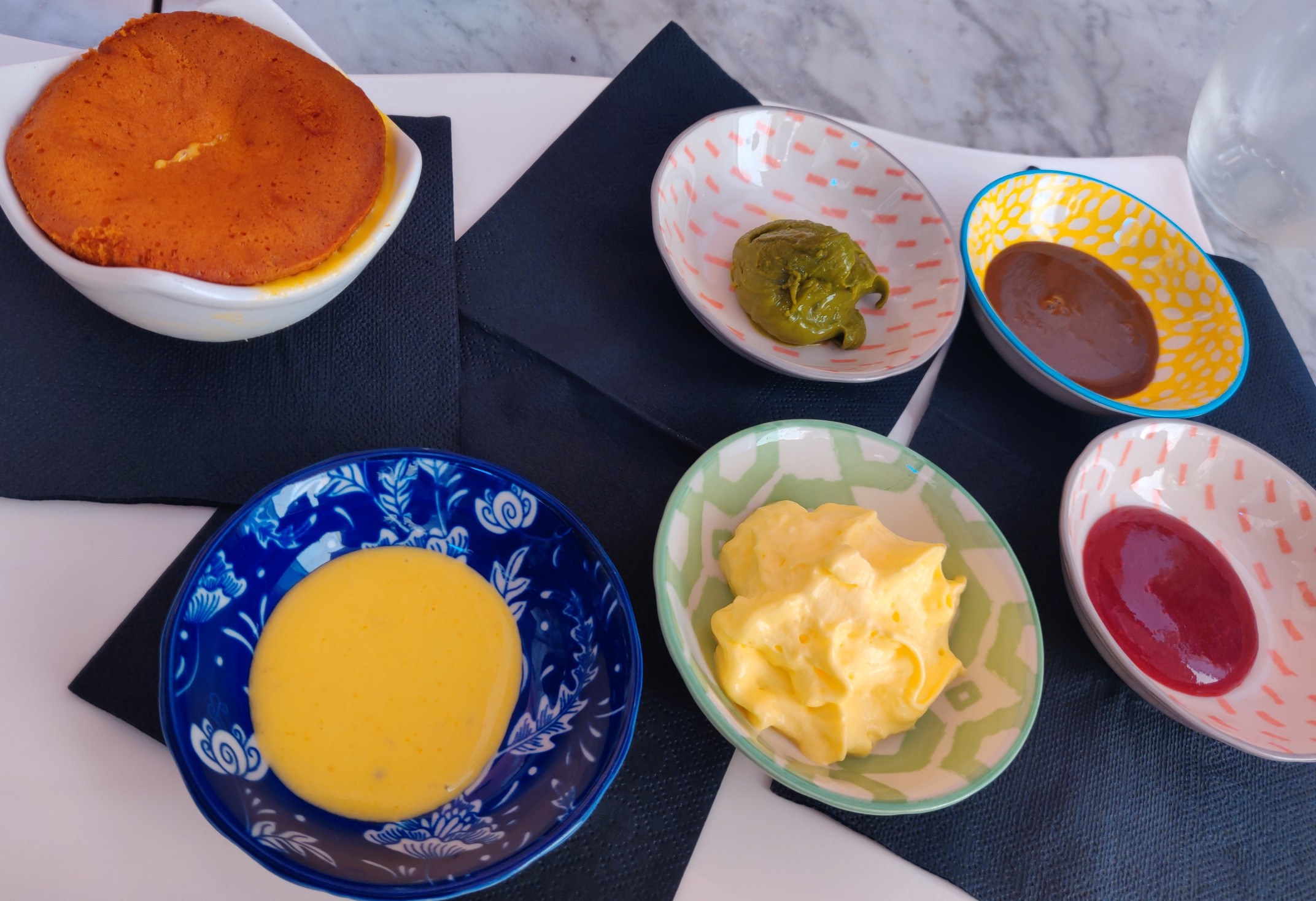 סלסלת לחמים לא צילמתי כי היא לא היתה משהו אבל הסקרנות של האישה למראה סלסלת לחמים תפוחים הביא אותה לשאול עליה, וככה קיבלנו את הצלחת הזו שבדרך כלל מלווה את מנת הנקניקים. מדובר על בצק שמטוגן בשמן עמוק ובפנים חלול לגמרי. מאד מאד מיוחד ומאס מאד טעים.