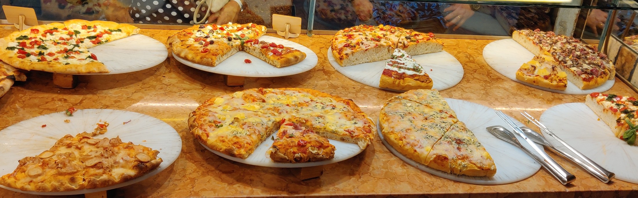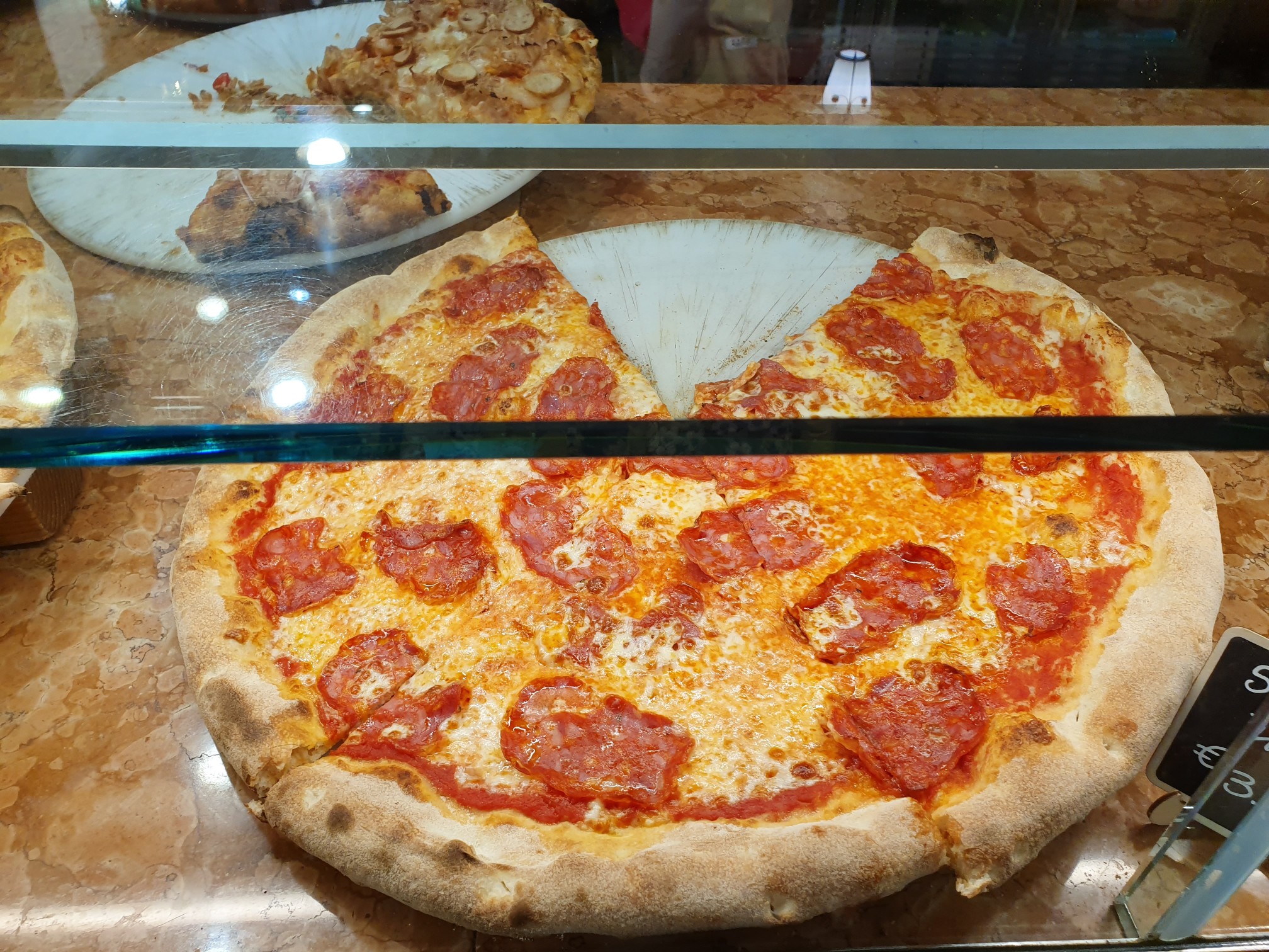 בערב הראשון רשמנו לעצמנו מקןם קטן של פיצות לא רחוק מגשר ריאלטו, בהליכה בסמטה בין בנייני מגורים. עד שלא מגיעים לא בטוחים שזה שם. מקם קטן. אין אפשרות לישיבה. הכל זה טייק אווי או בעמידה. כשהגענו היה ריק. תוך דקות התמלא. ממש כמו אצל עובד מהסביח - השקט בגיזרה מטעה.