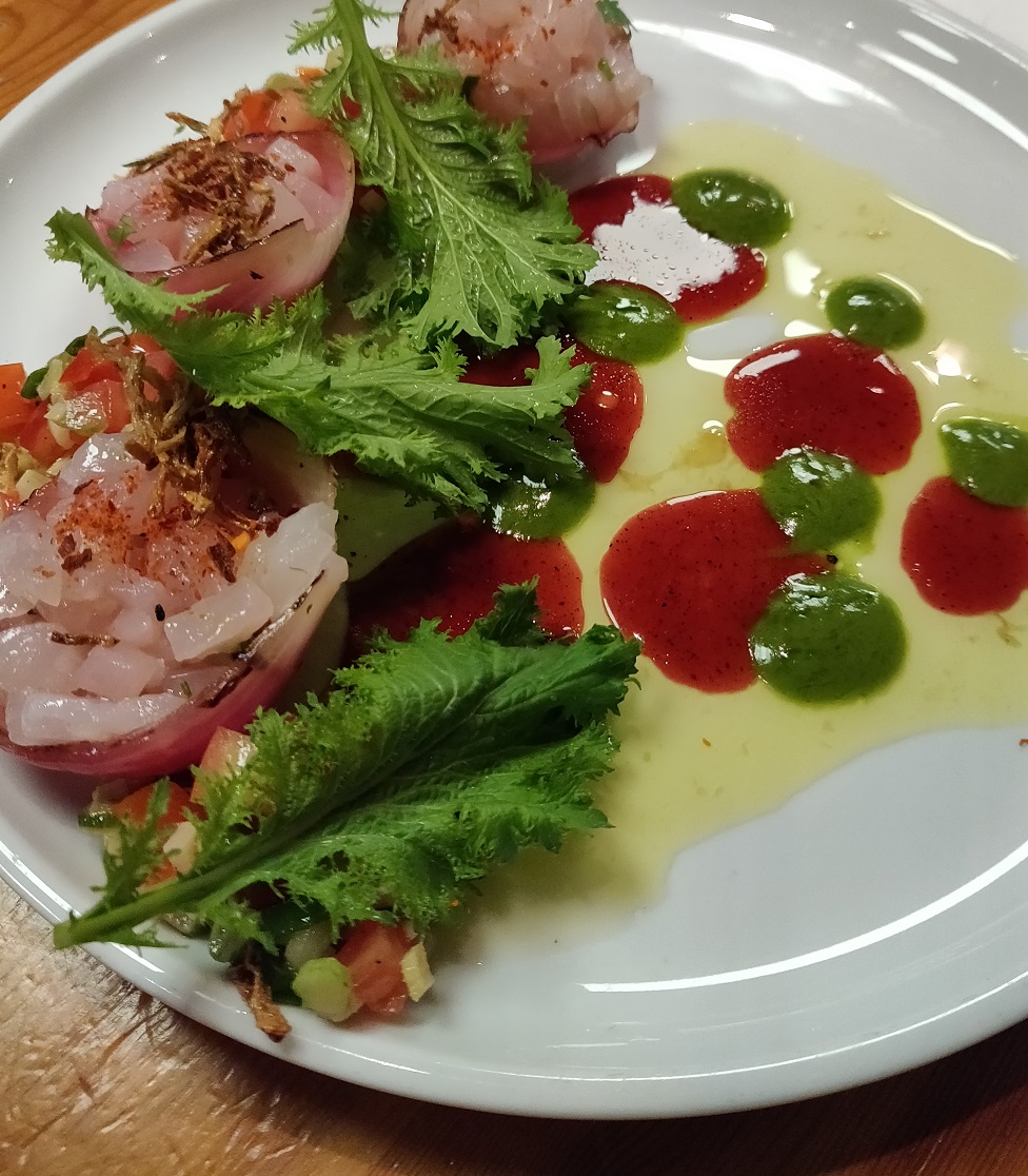 מנה מקסימה, שלשמחתנו - גם התגלתה כמאד טעימה. השבבים הקטנים מעל קוביות הטרטר הם קריספי ג'ינג'ר, שהוסיף אפקט מאד מאד נחמד לטעם ולמרקם. שיחוק מעניין שלא נתקלנו בו בעבר. היו גם נגיעות של לאבנה וסלסלת עגבניות והכל ביחד היה טעים ופרשי. האמת - הופתענו לטובה.