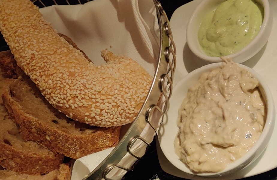 פתחנו בסלסלת לחמים עם בייגל'ה ירושלמי ולחם שיפון. חייב לתת פלוס על המחיר של הסלסלה. 10 שקלים לסלסלת לחם נראה לי מאד הוגן. מצד שני מינוס על זה זה שהלחם הגיע קר. אולי זו סטייה משפחתית אצלנו, אבל לחם לטעמנו צריך להיות מוגש חם. במיוחד זה הוריד לבייגלה הירושלמי, שיכל לקבל שידרוג אם היה מגיע חם. לשיפון זה לא הזיז, הוא היה סופר מוצלח גם ככה. עם הלחם הוגש ממרח מאד מאד לימוני, על הסף של להיות too much לימוני אבל מבחינתי בסדר גמור, והממרח השני - של חצילים - היה ממש טעים. הייתי בכיף לוקח מזה קופסה של קילו הביתה. ושוב סליחה על הצבעים המעוותים של התמונה. יש סיכוי שאם חייזרים בדיוק מתכננים את הפלישה לכדור הארץ והם רואים את התמונה הזו הם אומרים לעצמם OMG אם זה הצבע של האוכל שלהם אז בואו נחפש כוכב אחר. אז אולי בכל זאת התמונה הזו תרמה משהו לאנושות.