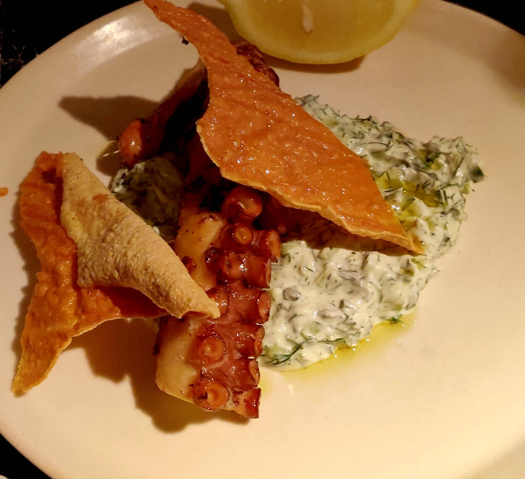 אחריה שחתה לשולחן שלנו זרוע של תמנון (48) שהוגש עם ציזיקי. אם מה שיש לי להגיד על המנה הזו זה שהציזיקי היה ממש טעים אז אפשר להבין שהיא היתה המנה הפחות מוצלחת בארוחה. עיקר הבעיה היתה הזרוע הנטויה. היא היתה קצת צמיגית, ולפי דיווחים שעברתי (הזדמנות להזכיר לכולם שיש לנו מנוע חיפוש...) גם "אבנר מבקר" מציין שהתמנון היה מאד over. אז יכול להיות שזה לא עניין של over אלא שזה מה שאפשר לנפק מהחומר גלם הספציפי הזה, אבל זה הוריד מאד את המנה. היה גם טוויל שבעיקר היה נחמד לאכול איתו את הציזיקי. אבל לסך הכל של המנה לא כל כך התחברנו, ותודה לספוט על הצל שהחשיך חצי מנה.