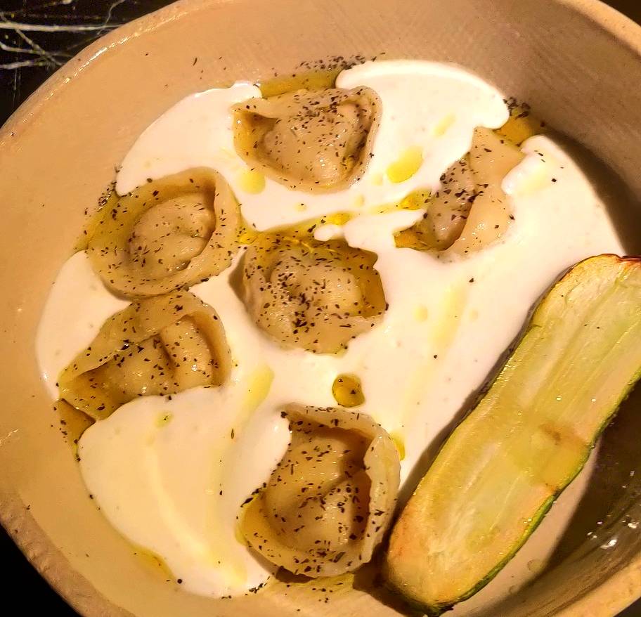 אחרונה בשרשרת הראשונות - שישברק (62) ממולא בקישוא וגבינת המאירי, כמובן עם קציפת יוגורט כבשים ופרוסת קישוא בצד. הכיסונים היו מעולים. בצק נפלא ואהבתי את המילוי הגבינתי. ממש לא חסר לי הבשר. היוגורט היה לי קצת אנמי על המנה, אבל אני חושב שזה בעיקר בגלל המקום שלה בסדר הוצאת המנות. יכול להיות שאם היא היתה מוגשת שניה, אחרי הסקאלופ, הדומיננטיות של הרוטב היתה יותר מודגשת. כאן אחרי מנות עם טעם מאד חזק (הציזיקי של התמנון וושקדי העגל) העדינות של היוגורט קצת הלכה לאיבוד. אבל סך הכל גם כן מנה מוצלחת. הייתי מדרג אותה במקום השלישי בארוחה הזו, כי הסקאלופס והשקדי עגל היו באמת מושלמים.