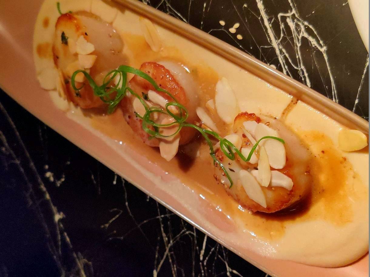 ראשנות הגיעו שלוש סקאלופס צרובות (72) על קרם שקדים וציר סרטנים שהוסיף הרבה עומק למנה. בתפריט כתוב צימוק איראני אבל כנראה שהסכם הגרעין לא מאפשר להכניס את זה למנה אז לא איתרנו אותו. ההכנה של הסקאלופס - פשוט פרפקשן. כל הכבוד למי שהוריד אותן בשניה הכי מדוייקת שאפשר. הרוטב עשה את שלו. מנה שפשוט חובה להזמין שם. 10/10. השבירת צום הכי טובה שאפשר היה לחלום עליה.