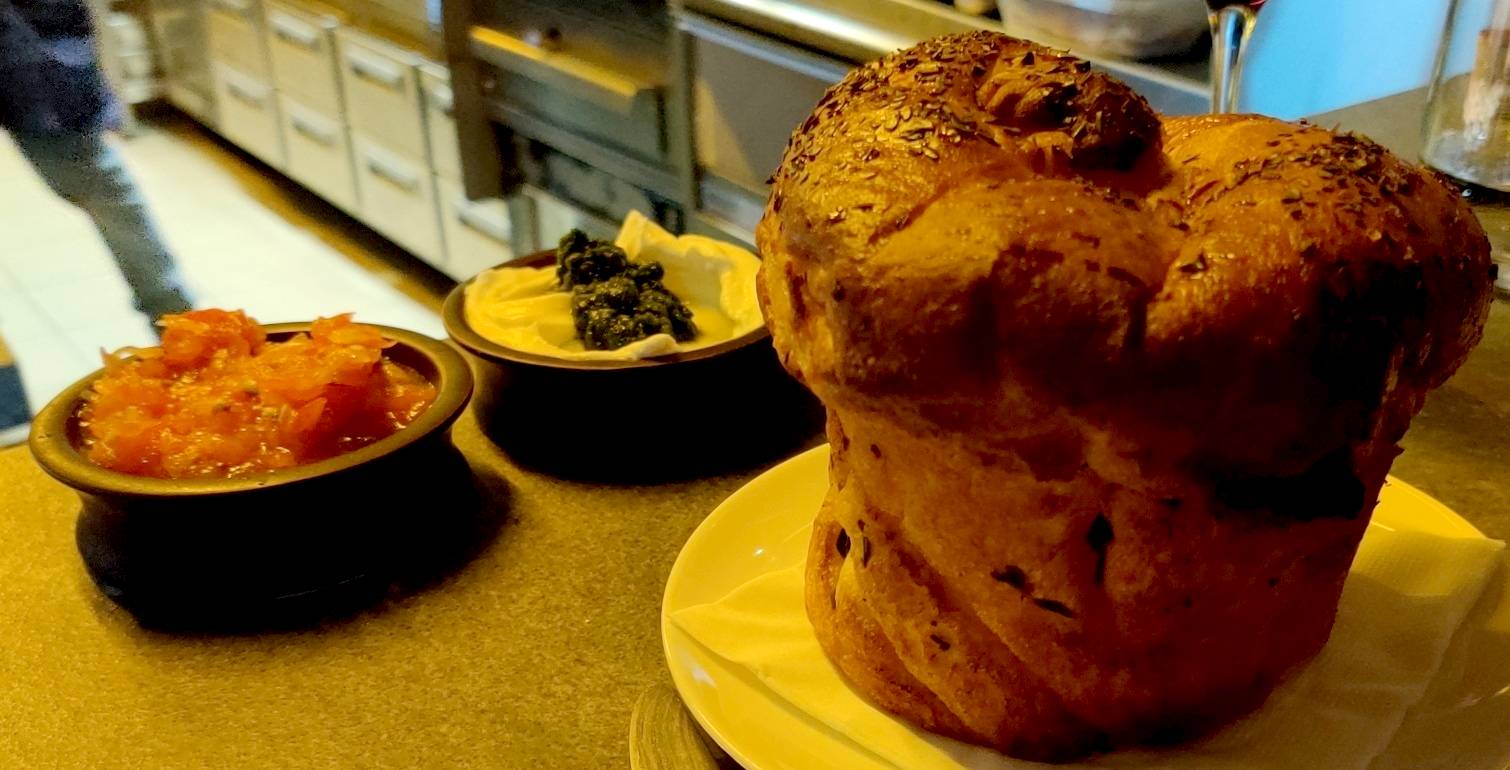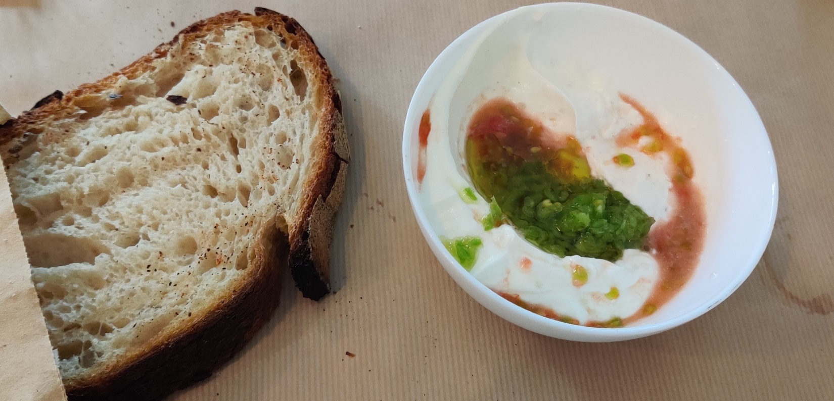 פתחנו במנת לחם מחמצת, שמאד אהבתי שנפרס עבה, כי זה הדגיש מאד את הקונטרסט בין הפנים המאד בשרני שלו ל"קשה" הפריך. ממש לא הפריע לי שלא הוגש חם - הוא היה מענג גם ככה. האישה יותר תובענית בנוגע לטמפרטורה של לחמים אבל נראה לי שהיא סלחה להם. הלחם הוגש עם קערית של קרם פרש, זרעי עגבניות וחריף שהזכיר את החריף במזנון והיו קומפניון מצויין ללחם. התימחור שלו הוא מהגבוהים בתל אביב ודי חסר פרופורציה, אבל בגלל איזו אי הבנה קטנה של המלצר קיבלנו אותו על חשבון הבית אז אני לא יכול להתלונן על משהו שלא שילמתי עבורו. אם מתעלמים מהמחיר - מנת לחם שווה ביותר.