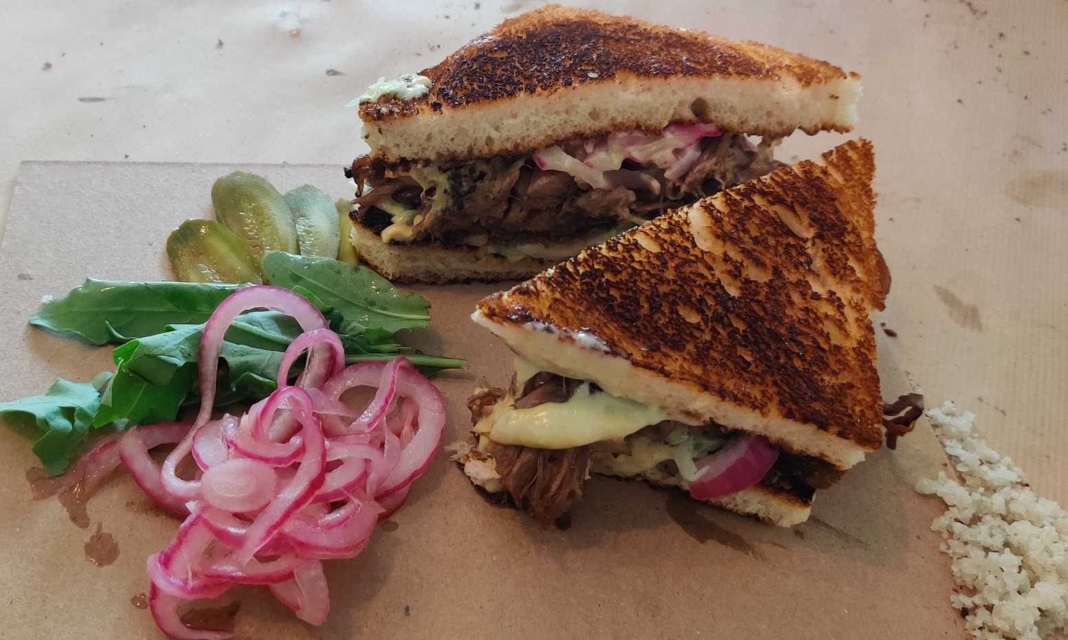 את הטוסט הצילו מהטוסטר בשניה האחרונה, כמו שגם אפשר לראות בתמונה. עוד שתי שניות בטוסטר זה כבר היה דורש לעשות טוסט חדש, אבל הצילו את זה באמת בזמן. בפנים בשר טלה מוצלח מאד. בצד בצל מוחמץ שהיה שיחוק בפני עצמו. ה-מנה של הארוחה. עשר בסולם היאממי.