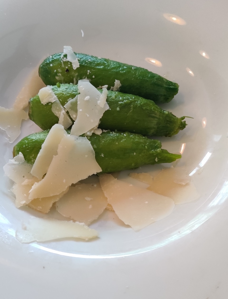 המנה שהגיעה אחרי זה אהההה רגע. מה זה. מה זה הדבר הלבן שעוטף את המנה והאורות של המסעדה משתקפות בו. צלחת?! מה קרה, שישי בשתים וחצי נגמרו הקרטונים???? חבל רק שהצלחת הביאה איתה גם את הנאחס של המנה הלא מוצלחת של הארוחה. פרחי קישוא שהוגשו בטמפרטורת החדר (לפני שהמזגן הקפיא אותו) והיו נחמדים בפני עצמם (נראה לי פעם ראשונה שיוצא לי לטעום) אבל לא מספיק בשביל להעמיד מנה קוהרנטית גם אחרי שגילפו עליהם גבינה וטיפטפו קצת רוטב. מנה סתמית לגמרי לטעמי.