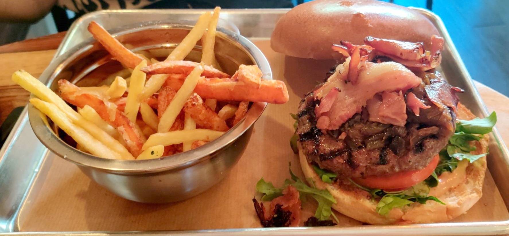 האישה לקחה המבורגר בתוספת בייקון ובצל. ממה שטעמתי ממנה - הקציצה של הבנץ מאד מוצלחת. טעם מעושן שמזכיר קצת את הקציצה ב-M25. היא ביקשה מדיום וקיבלה את הקציצה במרקם העסיסי שאני אוהב. את התוספות לא טעמתי אבל האישה היתה מרוצה. הנקודה החלשה - הלחמניה שלהם שהיא די רכה והתקשתה להחזיק את כל הכבודה.