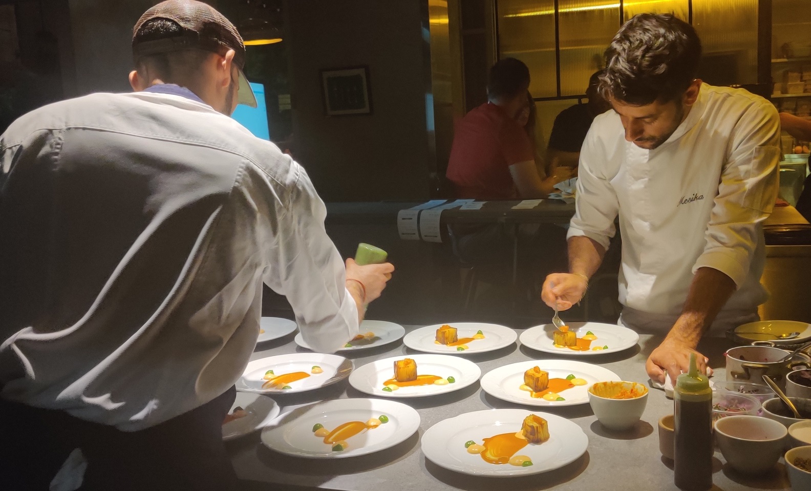 אם ההמלצה שם היא לשבת על הבר, אז אנחנו קיבלנו את המקומות הכי טובים שאפשר, במרחק נגיעה מהשף ומהשולחן שעליו מכינים את כל המנות. גם ב OCD הכינו לידנו חלק מהמנות אבל השולחן שעליו מצלחתים הוא יותר רחוק. כאן זה היה ממש במרחק נגיעה. כיף שאין כדוגמתו, ואותי זה פשוט מהפנט להסתכל על הצוות רוכן על כל צלחת בריכוז ששמור להקלדת עמוד הסיכום של עבודת דוקטורט. השף עצמו ניגש להגיד שלום והיה חביב מאד. תכלס יש סיכוי שאת הדעה שלנו על רוב המנות הם כבר שמעו ישירות (בכל זאת ישבנו במרחק אפס מהם) ואם כן אז הדיווח לא יחדש להם הרבה.