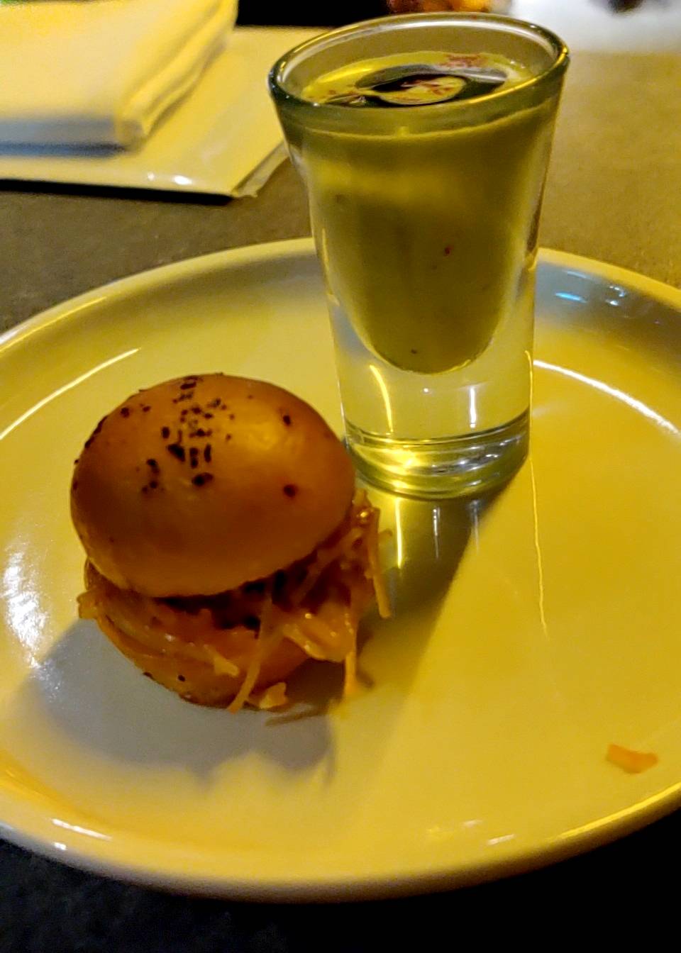 לפתיח הוגשה לחמנית בריוש עם טייגר שרימפס ושוט של ציזיקי. כרגיל בפתיחים האלה הלחמניה נגמרת לי מהר מדי, אבל האמת שהיא היתה החלק הפחות מוצלח של המנה. דווקא בגלל שהמילוי היה מאד רך, התבקש פה לחמניה יותר פריכה. אולי גם היה עוזר לה חימום קל. הבפנוכו שלה היה טעים והשוט של הציזיקי היה ממש ממש מוצלח.