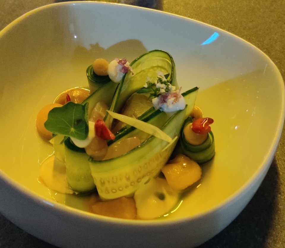 הטייטל של המנה הבאה היא סשימי מוסר ים, אבל אם במנת סשימי הדג הוא העיקר כאן מוגשים אולי שלוש חתיכות של דג והלב של המנה הוא מה שעוטף אותו: סלייס של מלפפון. מילונים כבושים. איולי של יוזו. ועוד כהנה וכהנה. למרות שהדג היה רק מרכיב אחד הוא היה בשרני במידה כזו שכן הורגש, אבל בשבילי המנה הזו היתה מבחן האם אני אצליח להנות ממנה גם אם שנים מחומרי הגלם הבולטים בה הם מהפחות חביבים עליי: מלפפון ומלון, והאמת שהיא היתה מהמוצלחות בארוחה. פרשית. שילוב טעמים מפתיע. המילון הכבוש - OMG! אם מוסיפים על כך שהיא יפה כמו ציור אז אפשר להכתיר אותה כאחת ממנות הדגל של המסעדה.