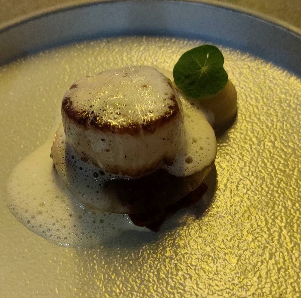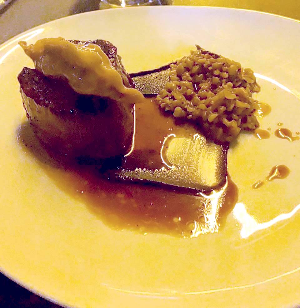 המנה הבאה עשתה פניית פרסה לצרפת. קוקי סן ז'ק צרובה ובצידה קרם של תפוח, וניל ורוטב Beurre Blanc של הדרים. שכבה נוספת היתה של ג'לי דאשי. ואם אני זוכר נכון היתה גם נוכחות של סלקים. על המנה הזו יש לנו מחלוקת. אני אהבתי את הסקאלופ ואהבתי את הרוטב הנלווה אבל לא הרגשתי שהם מתחברים לי ביחד, כי הסקאלופ, שהיא לא ניטרלית בטעם, לא התחברה לי טוב עם רוטב שהיה מאד מתקתק. לאישה זה התחבר בסדר גמור אז אתם מוזמנים ללכת לתמנע ולבדוק בעצמכם. לפחות הפעם היו לי את השאריות של הקובנה כדי לנגב את הצלחת.