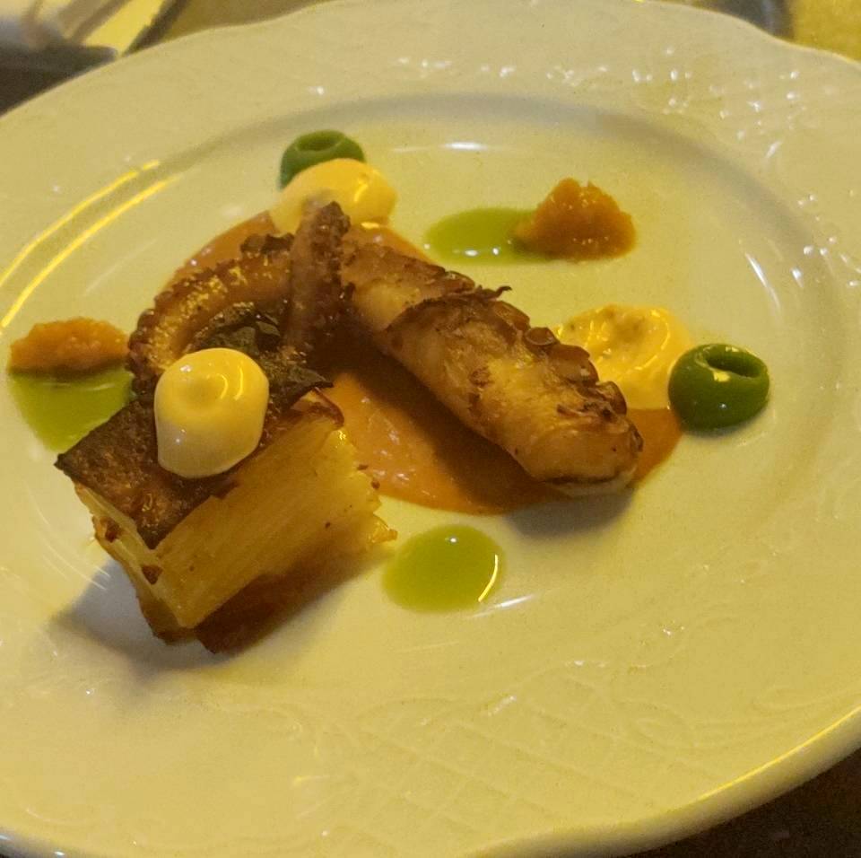 עוד מנה של ים - תמנון ובצידו גראטן תפו"א, שוב מנה ממש יפה עם שילוב צבעים מהמם שהצילום בתאורה החלקית לא הצליח, לצערי, להעביר. טעמתי את התמנון של האישה והיה הבדל די גדול במרקם שלו ממה שאני קיבלתי. שלי היה לא מוצלח, כשבחלקים מסויימים הוא היה כמעט לא ראוי להגשה. כאמור אצל האישה זה היה שונה לגמרי ואין מה לעשות - באוכל, להבדיל ממתמטיקה, אין 100%. לא נרשמו לי יתר המרכיבים של המנה אז לא אוכל לפרט מעבר לכך שהיה בה גם אלמנט מעט חריף ולטעמי חוץ מהפגם בטיפול בחומר הגלם היא היתה טעימה מאד, מבחינת שילובי טעמים - אחת משתי המוצלחות בארוחה (יחד עם הסשימי).