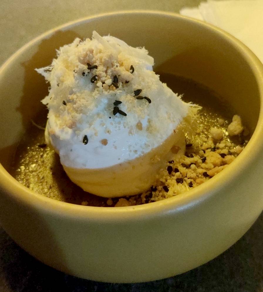 המנה הבאה היא למעשה העיקרית של הארוחה. במרכזה - נתח של פילה, שלהבדיל מהתמנון שלי היה עשוי מושלם. יחד עם זאת כמנה - היא היתה החלשה ביותר בארוחה. מעל הפילה כיסון ממולא בשקדי עגל ומנגולד - לדעתי פיספוס. גם לא קשור לפילה וגם, בחיאת, לקחת שקדי עגל ולטחון אותם למילוי זה כמו לקחת שטרות של כסף ולהשתמש בהם כדפי ציור. שקדי עגל אוכלים כשקדים. נקודה. בלי לטחון. בלי מנגולד. שקדים. מעבר לזה פילה, שהוא לטעמי נתח די אנמי בטעם, קל ונופל על הרוטב שאיתו הוא מוגש. הרוטב שהוגש כאן, בשילוב עם הקרם חציל השחור, היה לא מוצלח ולא החמיא לסטייק. הריזוטו בצד הוא מפריקי וסחטיין על הטכניקה אבל בדיוק כמו עם השקדים, הניסיון לקחת משהו אחד ולעשות ממנו משהו אר לא צלח: רוצה להגיש ריזוטו? מאורז זה יוצא יותר טעים. אין מה לעשות. בקיצור - לדעתי נדרש rethinking על כל המנה הזו.