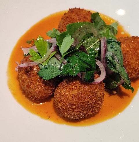 ארבעה כדורי ארנצ'יני (44) בפני עצמם היו טובים מאד. מעטפת קראנצ'ית ומילוי טעים. הם הוגשו על רוטב, שבתפריט מכונה "ויניגרט עגבניות שרי צלויות" ומהמעט שיצא לי לטעום ממנו הוא הרגיש לי כמו רוטב רוזה שסבל מנגיעות מיותרות של נענע שעיצבנו את הקטנה (עם הביקורתיות שהיא הגיעה היום כמעט ונתתי לה לכתוב את הדיווח - איזה כיף לגלות שהחינוך לפיינשמקריות נותן פירות) והאמת שהפריעו גם לי. בגדול לא היה אכפת לי לאכול ארנצ'יני בלי רוטב, אבל אם אתם שמים רוטב אז שהוא יהיה בצורה כזו שאפשר יהיה להגיד שאכלת ארנצ'יני עם רוטב. כמו שאפשר לראות בתמונה הרוטב די נוזלי, ובכמות שהוא הוגש זה יכל להיות סבבה בשביל לנגב עם חלה. אבל ארנצ'יני מצופה זה לא חלה שסופגת רוטב דליל אז או שנותנים את הרוטב בקערית עמוקה או שמוותרים. במקרה של הרוטב הזה היה עדיף פשוט בלי.