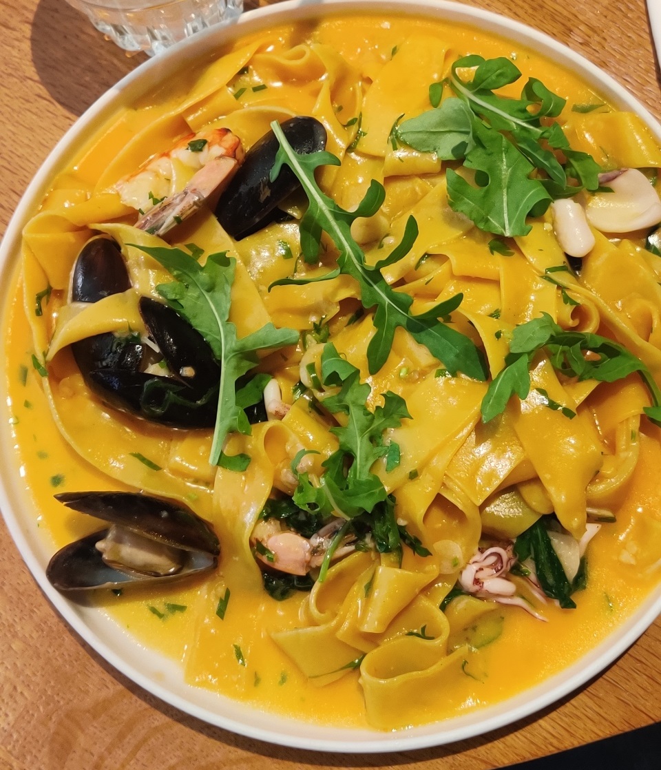 את העיקרית שלי, פפרדלה פירות ים (98) אני שמח שצילמתי כך שרואים את הצלחת כי זו צלחת שמגישים עליה לא מעט מנות שם. גם הניוקי וגם הפסטה ראגו מוגשות על אותה צלחות ואני חייב להגיד שהיא ממש לא מתאימה למנות של פסטה עם רוטב. פסטה זה משהו שדי מסובך טכנית לאכול אותו. צריך לגלגל אותה על המזלג. דברים זזים. דברים מתערבבים. חלק מהכיף גם זה לחטט בזה. לראות מה יש בפנים. להזיז. לבדוק. כשזה מוגש בצלחת עמוקה - יש לך את הקונטרה של הצלחת שעוזרת לכל התנע הזה (במחווה לסירס וזימנצקי תיפח רוחם) לא לעוף מהצלחת. כאן אתה כל הזמן צריך להיות מרוכז באיך הרוטב לא ימצא את דרכו לשולחן. חדשנות זה טוב, אבל יש דברים שלא צריך לסטות מהם. עיקריות מביאים ביחד. פסטה עם רוטב מגישים בצלחת עמוקה.