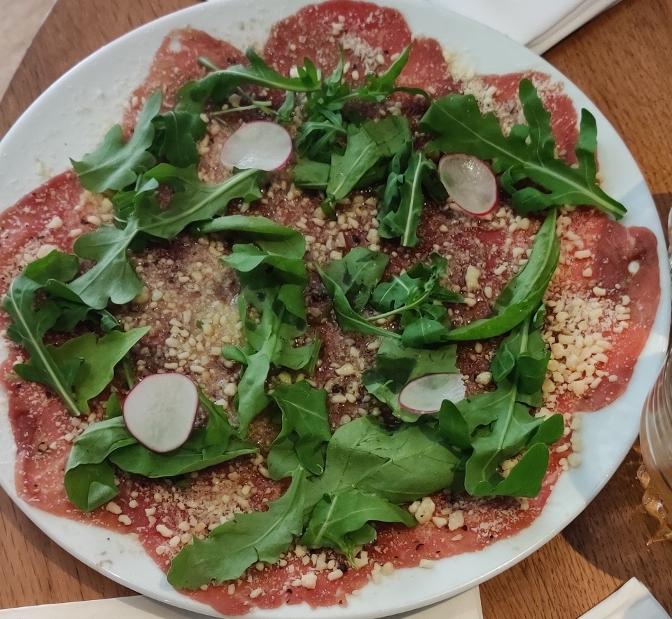 האישה הלכה על כיוון אחר לגמרי מכולנו - פיצה וקרפצ'ו. הפיצה - לא צילמתי ולא טעמתי (לא מסתדר לי שילוב של פסטה ופיצה בארוחה אחת). את הקרפצ'ו (66) דווקא כן, ולא אהבתי. טעם הבשר הלך לאיבוד לגמרי במתקתקות/חמצמצות של הרוטב והמנה היתה הדגמה מעולה של איך להרוג קרפצ'ו. חבל, כי דווקא הבשר נראה עם הרבה פוטנציאל אם רק היו נותנים לו לדבר ולא מטביעים אותו.