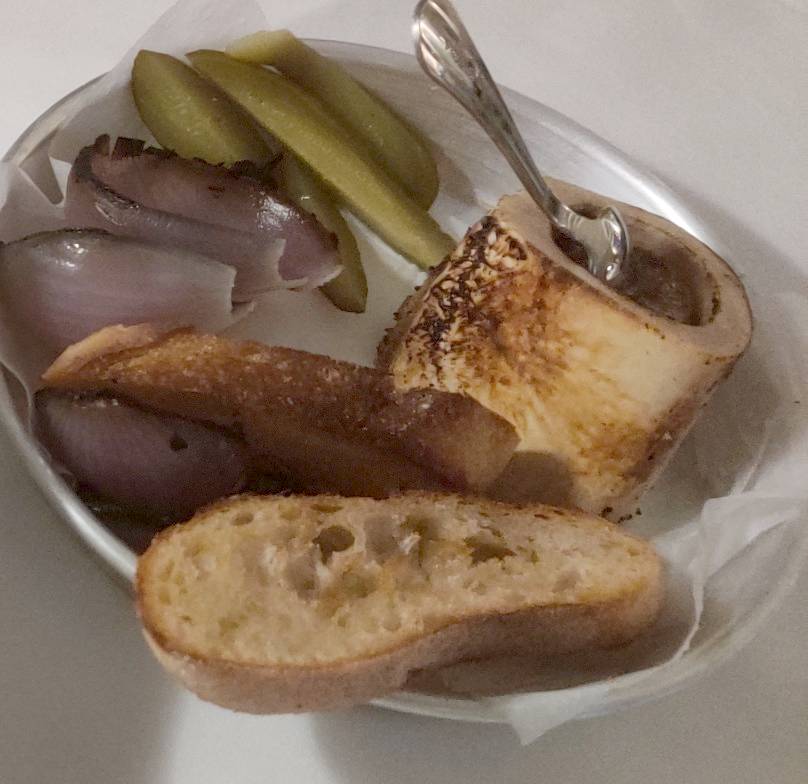 המנה השניה - טרטר שייטל (85). גם כאן - הגשה מאד לא שגרתית. החלק השגרתי יותר היו הטוסטונים שהוגשו לצד המנה ואיתם בצל מעט חרוך, מלפפונים חמוצים ומח עצם, אבל הטרטר, כמו שאפשר לראות בתמונה - עטוף בעלים. מעט גילוחי פרמז'ן. המשחה על הצלחת זה איולי חמאה מזוקקת. מיוחד, מעניין טעים וכולסטרולי להחריד.