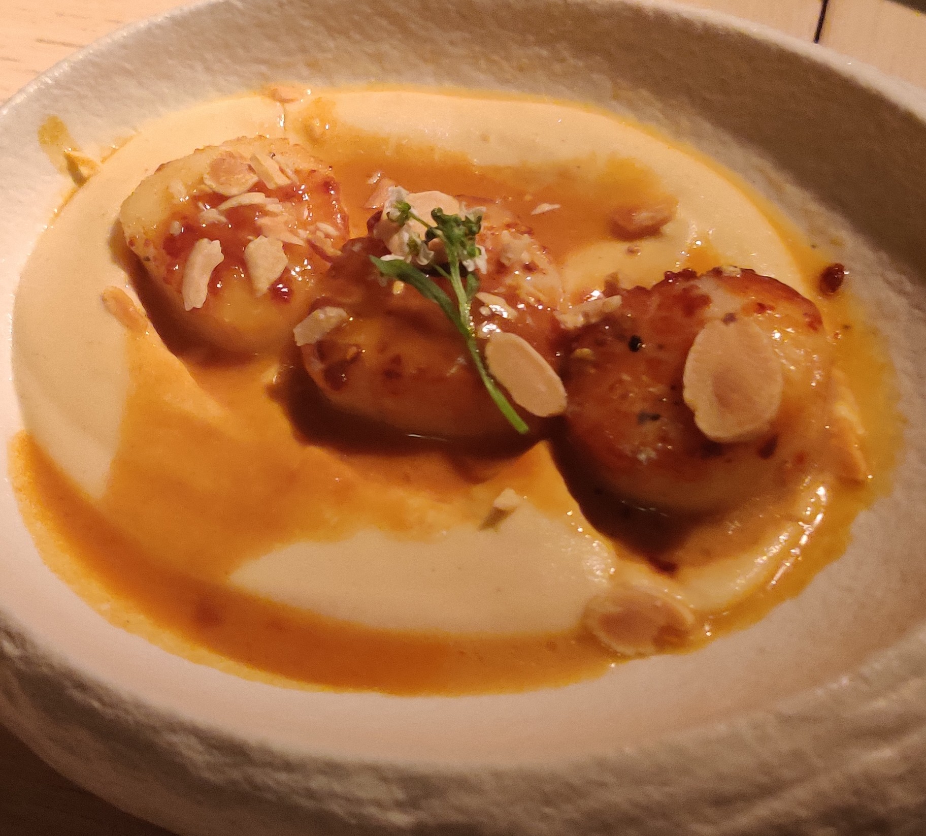 סקאלופס צרובים (72) על קרם שקדים מתקתק.