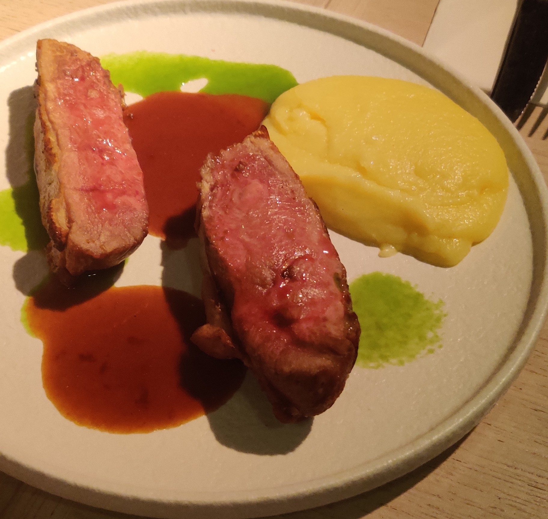 לעיקרית (חזה ברווז, 122), כמנהגן של עיקריות, לא היה סיכוי לעמוד ברף של הראשונות. אמנם הרוטב המתקתק (ציר דובדבנים ורכז רימונים) היה טעים והפירה ראטה היה מצויין, לנתח עצמו, ורדרד ככל שיהיה, היה מרקם לא אחיד, עם חלקים נעימים יותר ונעימים פחות ללעיסה ובכל מקרה לא יכל להגיע לפסגות של המנות הראשונות. תכלס הייתי מזמין עוד ראשונה במקומו.