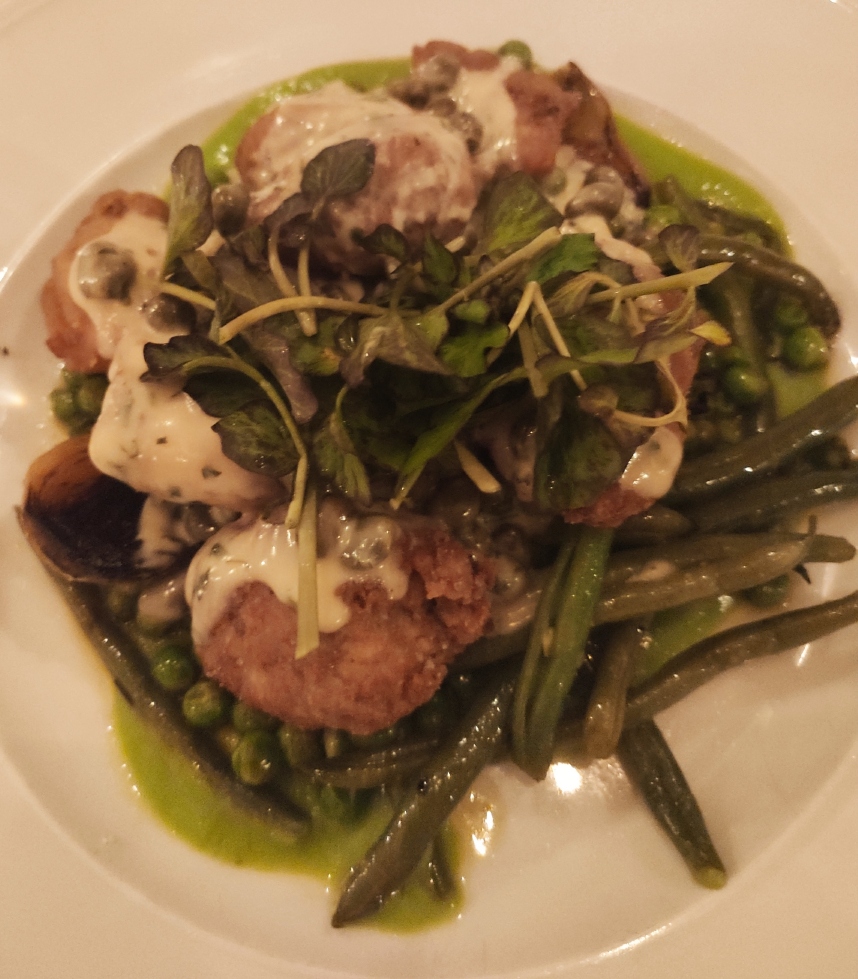 המנה השלישית – סלמון עטוף בפרושוטו ברוטב מיסו מייפל. יש להם שלוש צורות הגשה של סלמון. זו נשמעה הכי מדליקה. האמת שכשקוראים את זה זה נשמע קצת קישקוש אבל השילוב עשה את העבודה וזו היתה המנה הכי מוצלחת מבין השלוש. בדרך כלל אני לא מת על שעועית שזורקים לצלחת כתוספת אבל שלהם היתה ממש מוצלחת.
