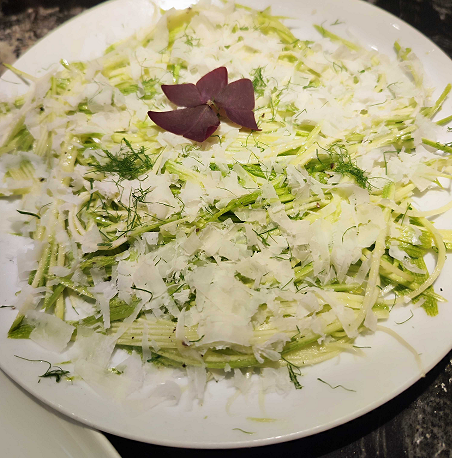 פתחנו בסלט הזוקיני "א-לה רומא" (58) שנראה לי שאנחנו מזמינים אותו קבוע עוד כשהמסעדה היתה במקום הקודם. ההתרשמות נותרה בדיוק אותו דבר כמו פעם קודמת: הוא טעים וכיפי, הפקורינו נותנת לו אוממי שעושה חשק לעוד, אבל הוא ממצה את עצמו בשלב כלשהו ולכן הייתי שוב ממליץ למסעדה לאפשר להזמין ממנו חצי מנה.