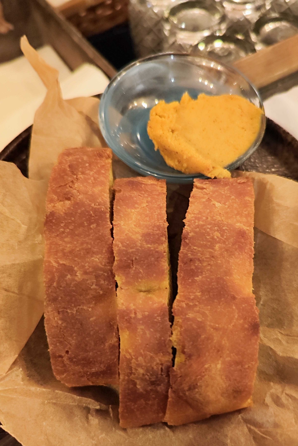 פתחנו עם מנת לחם מתובל וחמאת צ'וו (19). הלחם מתובל, דחוס, ספוגי מאד. לחם של ניגוב בעיקר. הצ'וו שמתבל את החמאה, כך מסתבר, היא תערובת של למעלה מ-10 תבלינים (אפרופו המטבח ההודי עתיר התבלינים). למי שרוצה לטעום בבית - אפשר להשיג את זה בחנות ביהוד ולפי מה שכתוב שם יש בזה בין היתר חילבה, הל, כמון, ציפורן, פפריקה חריפה, פלפל אנגלי, ועוד רשימה ארוכה. טעים מאד.