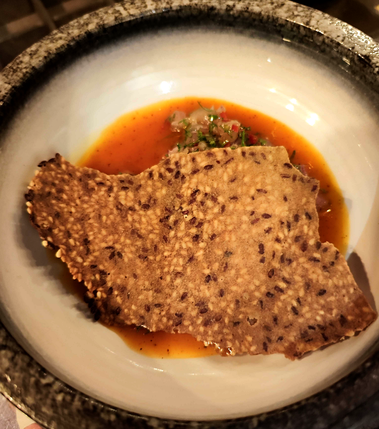 טרטר דג מאגם אוואסה (65) עם רוטב דלעת מוחמצת, שמן ברברה וקרקר טף שקצת מסתיר את הדג... חבל שלא הזזתי אותו לפני הצילום. אלעזר מרבה לספר על הדגים הנאים שאוכלים ישר מהאגם. אני לא בטוח שהדג הזה ספציפית הוא מהאגם או שהאגם הוא רק ההשראה למנה, אבל זה היה טעים ממש. מנות של דג נא יש כמעט בכל מסעדה וכיף לטעום גירסה שונה לגמרי בטעמים. אהבנו את החמיצות/חריפות של הרוטב והקרקר הזה, שכבר נתקלנו בו אצל יניב גור אריה, הוא להיט שצריך למכור בסופרים. האמת שאחרי המנה הזאת קצת נשמתי לרווחה כי פייבוריט או לא פייבוריט לפעמים בטלביזיה השופטים מתפייטים על מנות ותכלס לך תדע עד כמה זה באמת טעים או מיוחד, אז הנה מנה אחת לפחות שמראה שההתלהבות לא היתה על ריק.