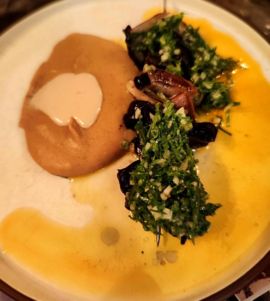 מנה 4 - שיפוד פטריות צלויות (48) על קרם שירו, ה"חומוס" האתיופי, שמוגש כאן סמיך יותר, וטחינה. באודישן הוא הגיש מנה מאד דומה רק ששם זה לא היה על שיפוד. מכל המנות זו המנה שהיא אולי הכי הארד קור בטעמים. לאישה היה יותר קשה איתה למרות שבסך הכל אהבה, אני מאד אהבתי, אבל חייב לציין שבאודישן אלעזר הגיש לצד המנה לחם, את אותו לחם שהוגש בתחילת הארוחה. אצלנו הלחם כבר אזל ובהחלט חסר יחד עם מנה שהיא מאד משחתית.