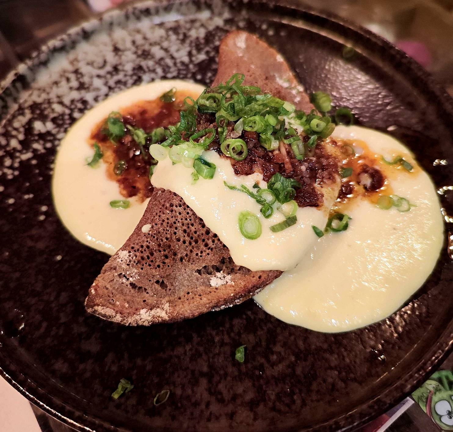 מנה מספר 3 - קרוקט תפוח אדמה וברזולאה (51). העשיה של הקרוקט מושלמת, ומוכיחה עוד פעם שכדי להיות מוצלח בלעשות פיוז'ן אתה צריך קודם כל לשלוט בטכניקות שאתה מפנז'ן. החלק האתיופי של המנה הוא מטבל ה-Aweza האדום, מטבל פילפלים חריפים שבמקור משמש למריחה או כבסיס לרטבים וכאן כמשלים של הקרוקט. זה היה האלמנט היחיד שהיה יחסית חריף. לא חריף אש, אבל בכל זאת אני מציין את זה כי זה לא כתוב בתפריט ואם ביתר המנות היתה חריפות מתונה כאן הרגישים לחריף יצטרכו להזהר. הברזולאה לא היה ממש קשור לי למנה אבל מעבר לזה - מוצלח מאד.