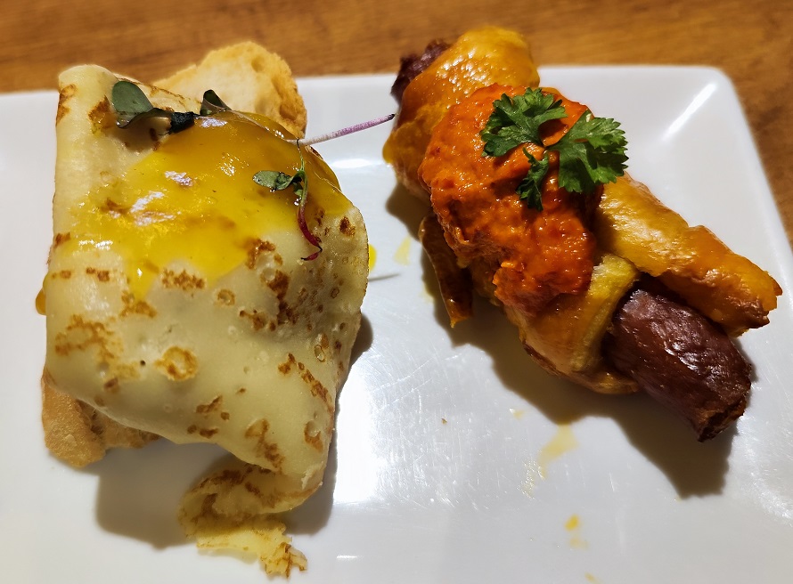 האפטייזרז שהגיעו עם התפריט שלי: שני קרוקטים של תפוח אדמה. בסדר, חוץ מהבחירה שלהם כאפטייזר. הצלוחית שליד: נתחי דג קוד עם אלמנט קראנצ'י לא ברור. זה היה מאד סתמי ומנומנם, בטח לא המנה שתעורר לך סקרנות וציפיה להמשך הארוחה.