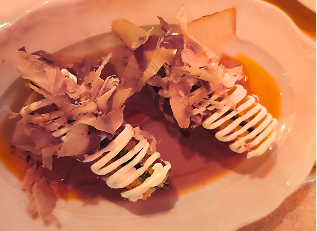 המנה הראשונה שהגיעה - סנדביץ' שרימפס. כמו שאפשר לצפות, מדובר בכריך פתוח שיושב על בריוש צרוב שהייתי שמח לקבל אותו בתור המנת לחם. למעלה - איולי וצ'אנקים של סרטנים, למטה - רוטב בוטנים חריף (שזיהינו בו ג'ינג'ר וצ'ילי). מנה עם טעמים מאד שפיצים שפחות תתאים לאנשים שהטעם שלהם אוהב מנות פחות "מקושקשות", אבל אנחנו ממש אהבנו והיה היתה לנו מאד מאד מאד טעימה.