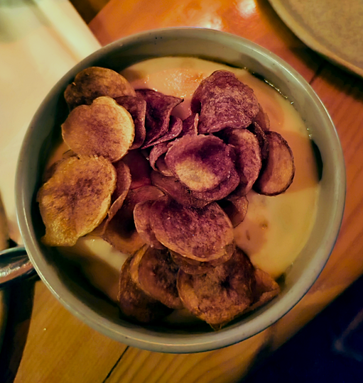 המנה השניה שהגיעה: ניוקי פריזאי (78). הניוקי עצמם במרקם אוורירי כייפי. למעלה הפירורים של האצה שהוסיפו טעם דגי וקראנצ'יות נחמדה. הבעיה של המנה היתה שהכמות של הבר בלאן שעליו הוגש הניוקי לא היתה מספיקה בשביל לעטוף ולחבר את הכל ולכן התוצאה היתה קצת חיוורת, על אחת כמה וכמה כשהמנה מוגשת אחרי מנה מפוצצת בטעם. קצת יותר בר בלאן ואולי להגיש אותה לפני הסנדביץ היו מקפיצים את המנה.